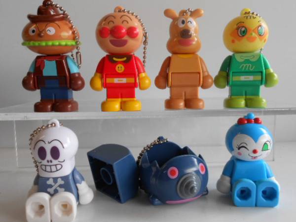 1.アンパンマン 2.コキンちゃん 3.ハンバーガーキッド 4.メロンパンナちゃん 5.めいけんチーズ 6.ホラーマン 7.もぐりん ◇もぐりんは中央のパーツがとりはずせるよ!! ドールをのせてころがしてあそべるよ! |