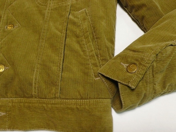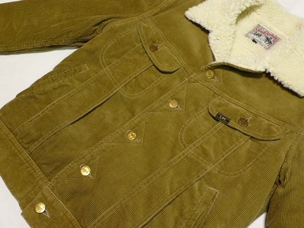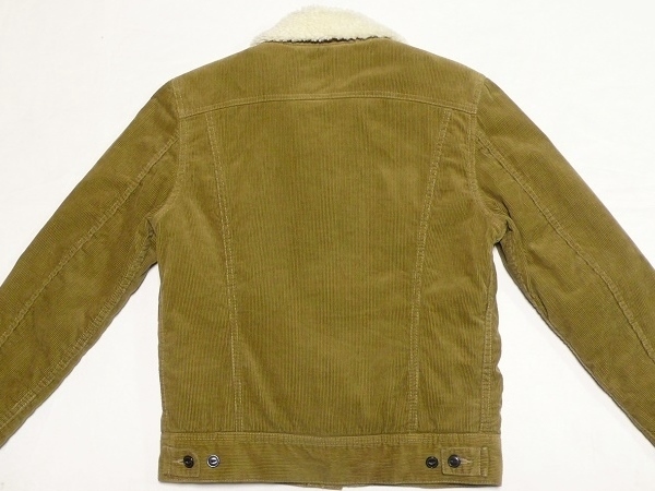 | Lee・リーの「OUTERWEAR」シリーズのウィンター・ジャケットの定番「ストーム・ライダー」のコーデュロイ素材のボア・ジャケット・バージョン「BOA STORM RIDER」のサイズSMALL(36相当)になります。(品番LT0523-1427、定価15,000円、税込16,500円)。カラーはサンドブラウン(ライト・ブラウン)でカーキ系のブラウン・コーデュロイの表地に内側のボア・ライニングはオフ・ホワイトとなります。コットン100%の中畝のコーデュロイ素材に保温性の高いポリエステル/アクリル・ボアをライニングしたウィンター使用の「ボア・ストーム・ライダー」でボタンは「Lee Riders」刻印ボタン、サイド・アジャストは黒のネコメ・ボタン、ラベルは「STORM RIDER」プリント・タグ、ピスネームはMR無しのLee、R表記、シルエットはライダース・ジャケットをベースにしていますので、ボディラインに美しく沿うように立体裁断されており、袖の裏地にはポリエステルのキルティングが使用されていますので袖だけ膨らむようなことも無く、防寒性の高いボア・ライニングながら美しいシルエットを保っていますので、バイクのライディングなどでタイトに着こなしたい方にもオススメです。状態は着用によるシワなど若干の使用感はあると思いますが全体的にシミや汚れの無いキレイな状態で表地のコーデュロイのキズなども無く内側ボアのツブレや汚れなどもなく、袖裏のキルティングも糸のほつれなども無く非常に良い状態になると思います。メーカー適合サイズはチェスト80~88cm、身長155cm~165cm。実寸は肩幅(直線で)約44cm、着丈(衿下より)約58cm、身幅(腋下で)約50cm、袖丈(肩口から先まで)61cmとなります。(素人採寸ですので多少の誤差はお許し下さい。)素材表示は表地綿100%、裏地ポリエステル77%、アクリル23%、袖裏ポリエステル100%となっています。洗濯済み。中国製。中間色の為、画像ではモニターにより色の違いが出ると思いますがカーキ系のベージュ・ブラウンになります。 | |||