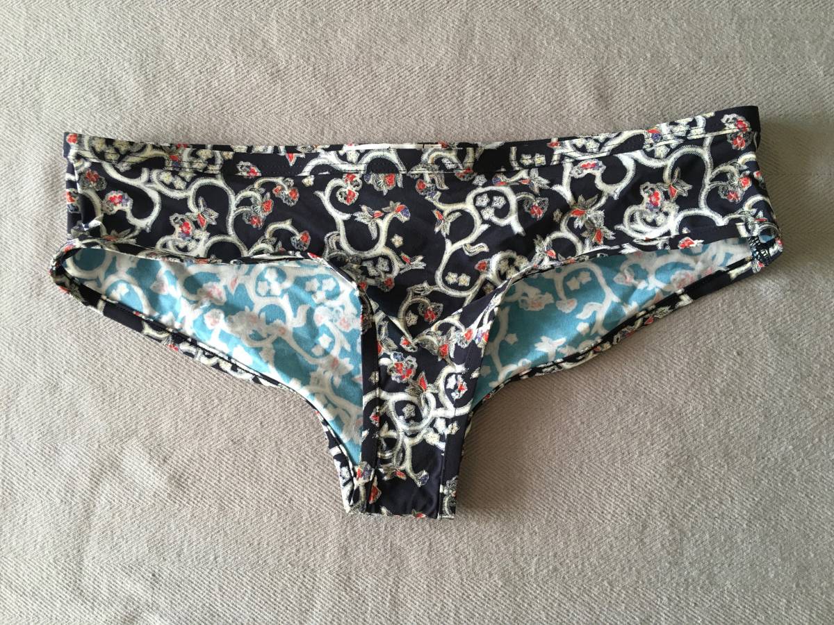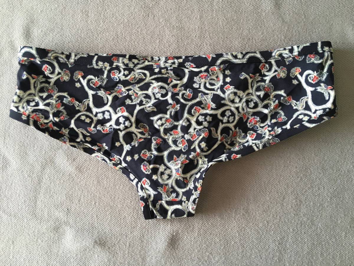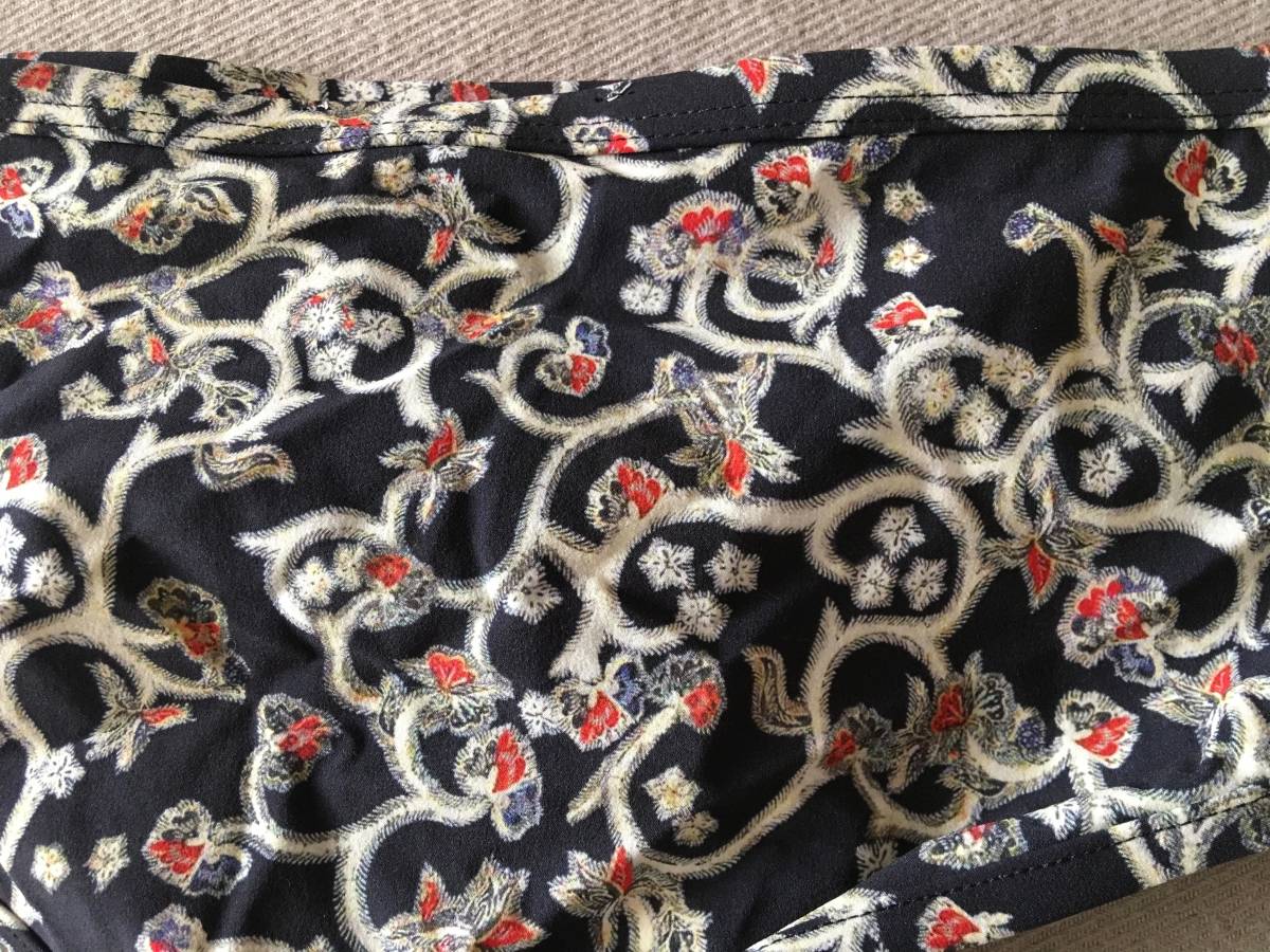 サイズは36、Mくらいかと思います。色はネイビー系にお花のような柄です。