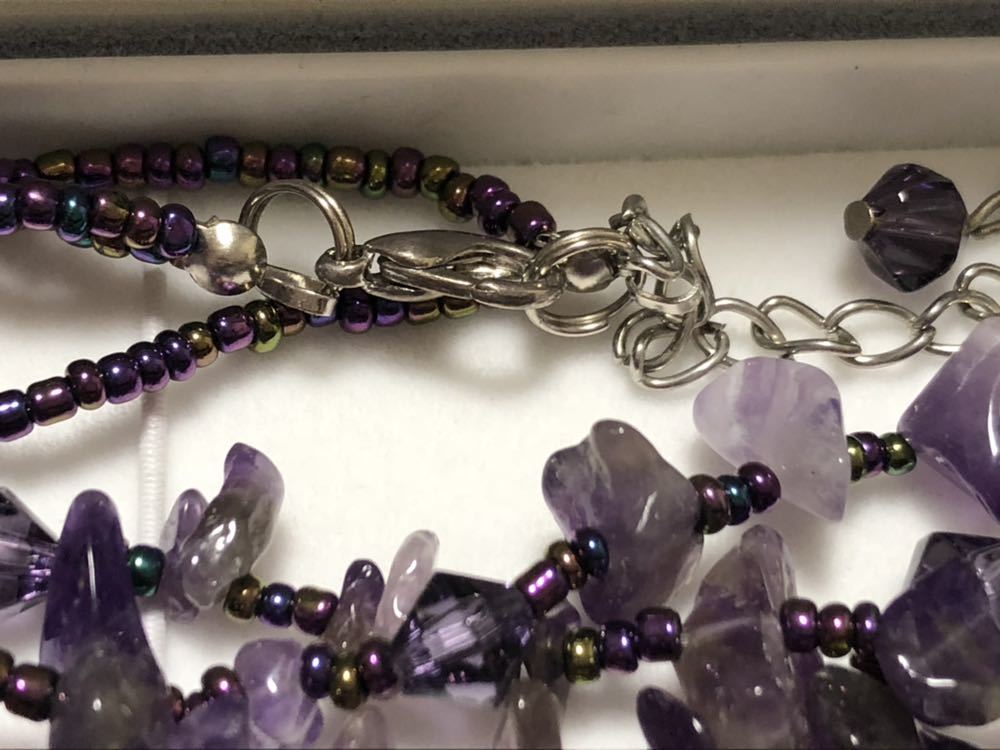 アメジストを使用した、さざれ石と環のロングデザインネックレスです。長さ調節可能、状態良好です。