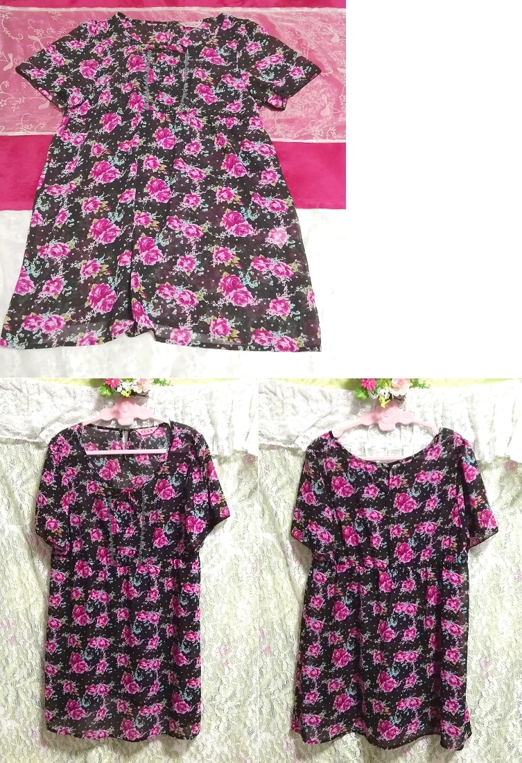 ピンクと黒バラ花柄ネグリジェチュニックワンピース Pink and black rose flower pattern negligee tunic dress