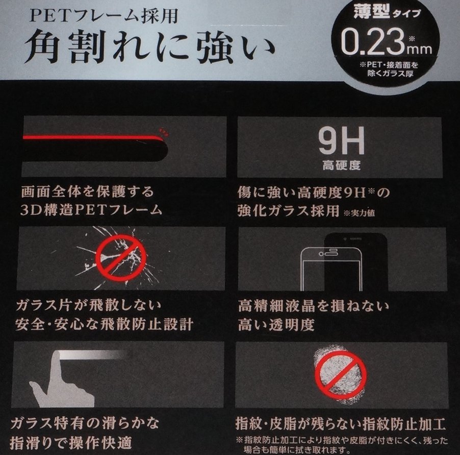 角割れしないフレーム付き。 美しいガラスで画面の端まで保護するフルカバータイプのガラスフィルム。