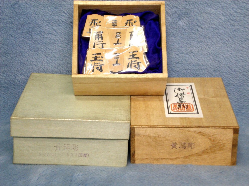 材質は黄楊で、手彫り漆書きの将棋駒セット桐の駒入れ付です。
