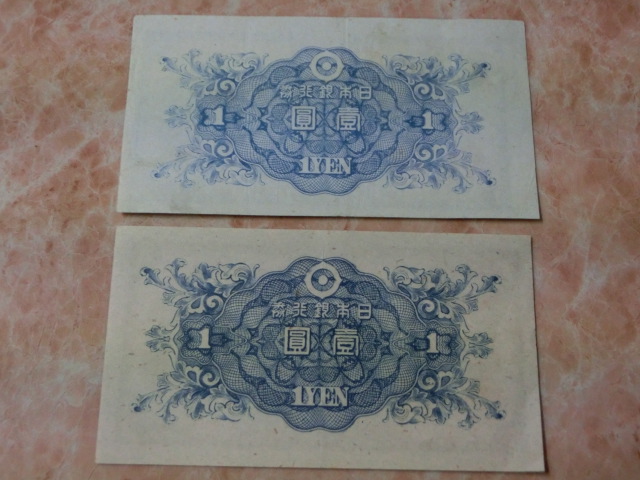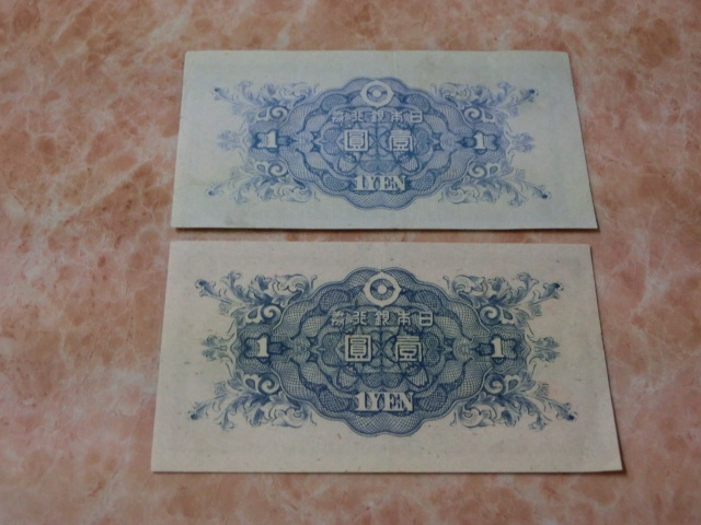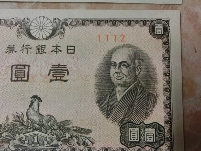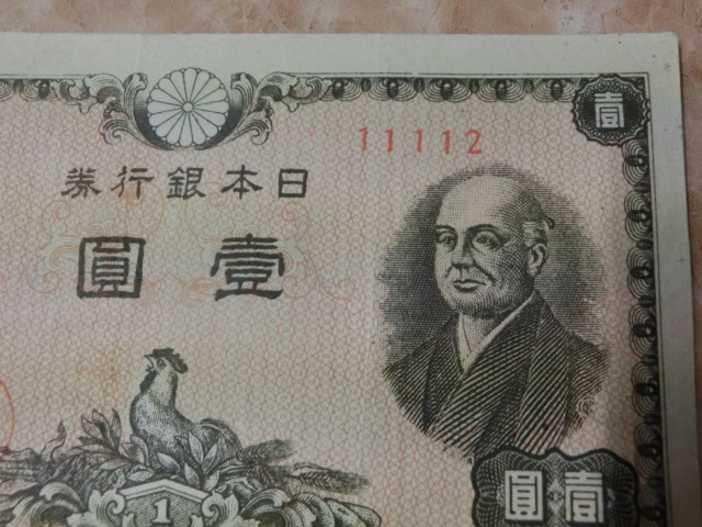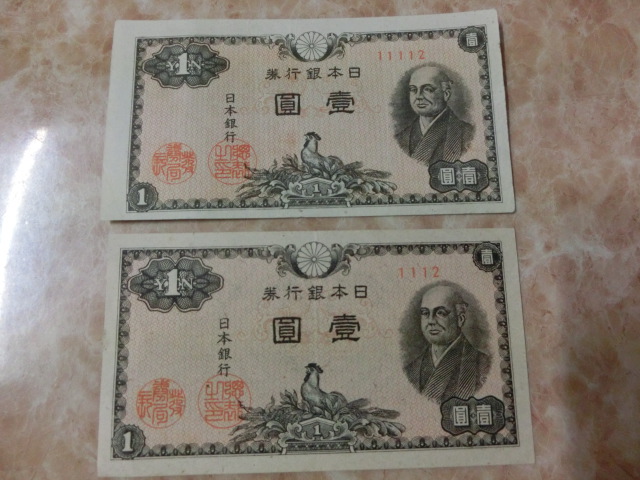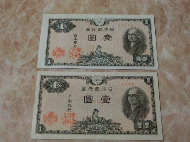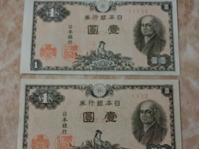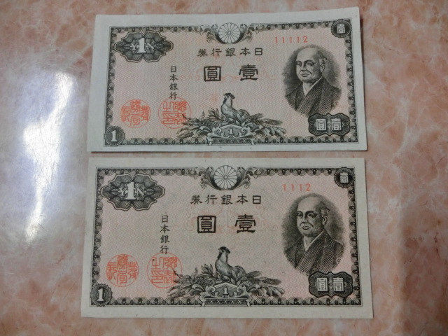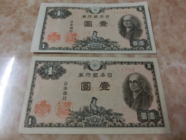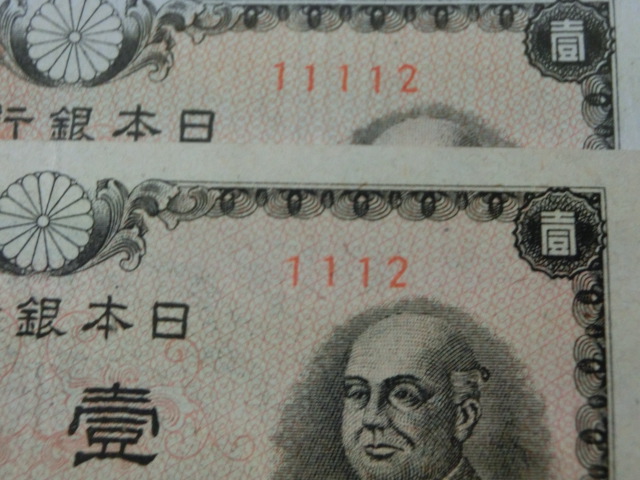 日本銀行券A号1円 二宮1円の初期ロットNo.1112・11112の2枚セットです。