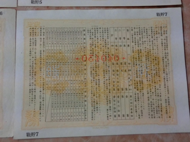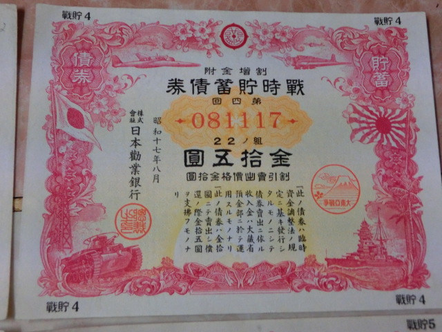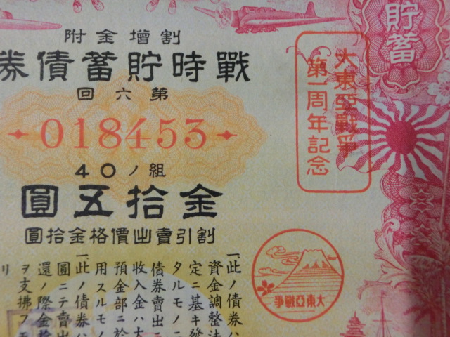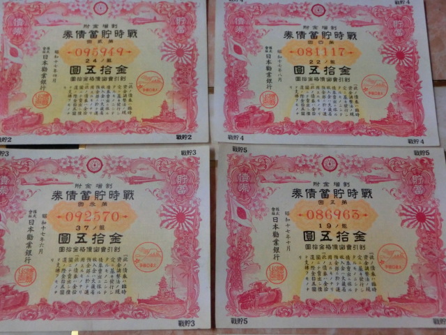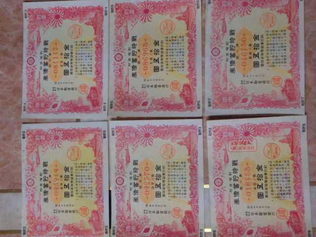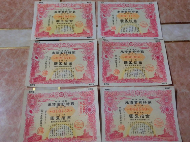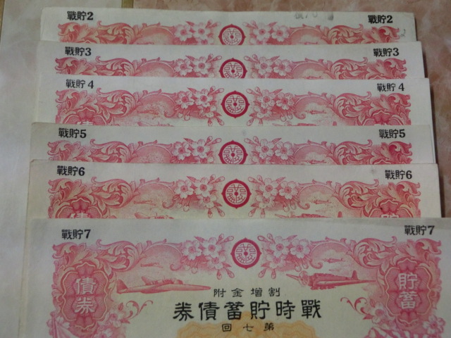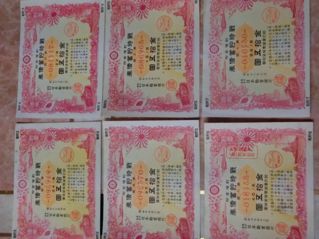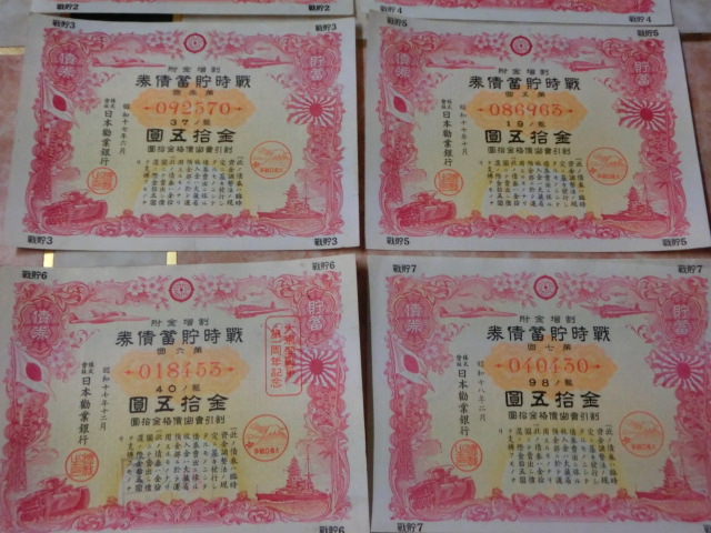 戦時 貯蓄債券 金拾五圓の第2・3・4・5・6・7回の美品を6種6枚セットです。