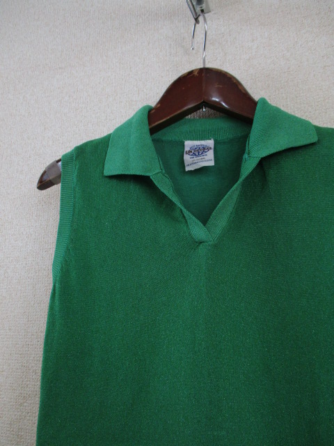商品紹介 | 緑のノースリーブニットです。 開襟のエリでスッキリとした形です。 細かいラメが混ざっています。 《素材》 レーヨン70% ナイロン30%(スリット糸使用) |