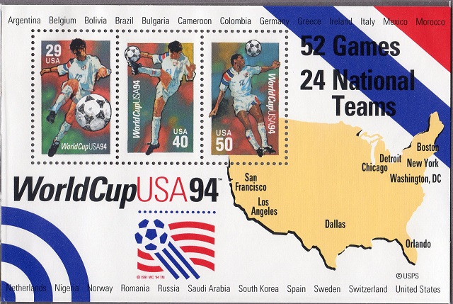 1994年に全米各地で開催されたワールドカップ・アメリカ大会を記念した小型シートで米国切手が3種使用されています。状態は大変いい方だと思います。