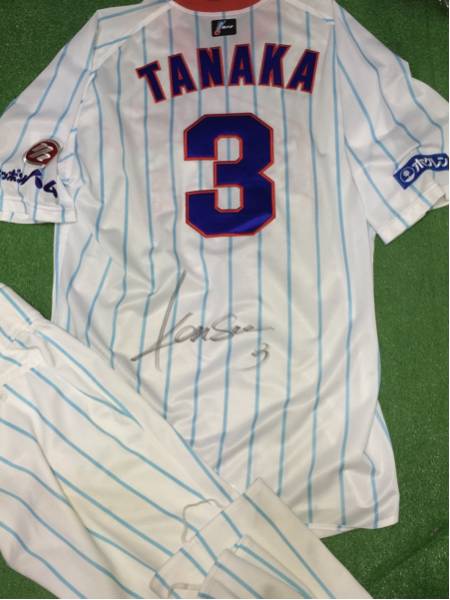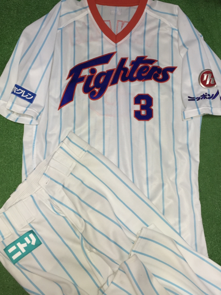 北海道日本ハムの田中賢介選手が’15シーズン公式戦のレジェンドシリーズで実使用した直筆サイン入りユニフォーム上下です。
