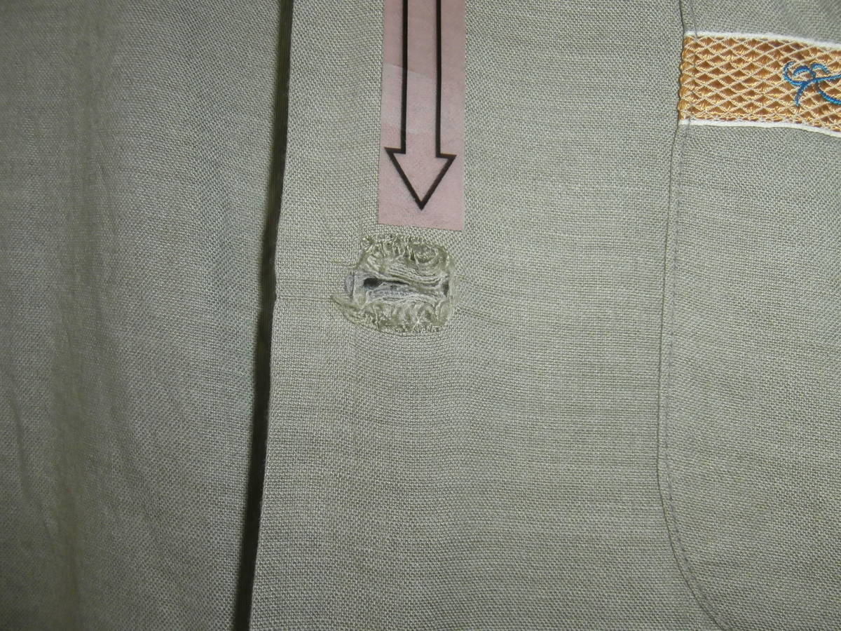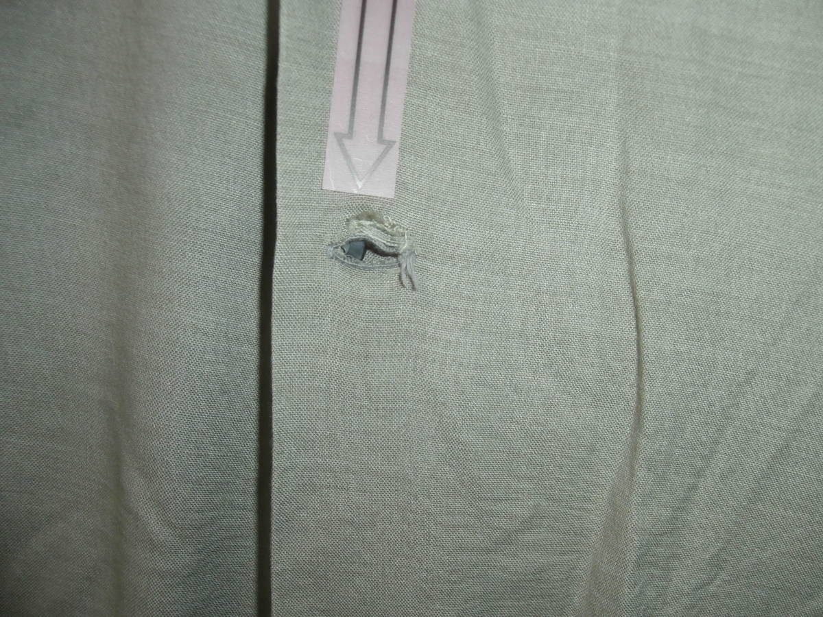 状態は全体的に使用感が見られ、フロントボタンのボタンホールに解れ(画像⑤⑥参考)が見られますが、その他、特に気になるような大きなダメージは見当たりません。