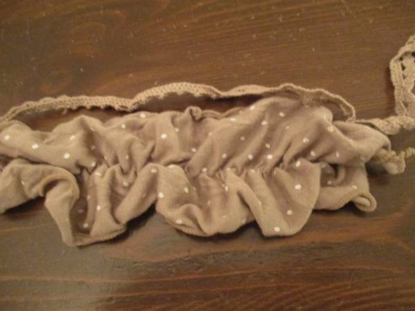 | 商品紹介 | ベージュのベースに白ドット柄がかわいいです。 レースの細い紐に本体を空間を空けて取り付けてあるデザインです。 本体はシワ加工がされています。 |