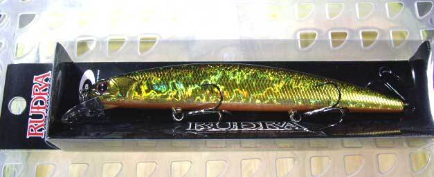 ビッグベイトの「寄せる力」とノーシンカーワームの「喰わせる力」。これまで全く相容れることのなかった二つの性能を、ビッグミノーというカタチで一つにしたのが阿修羅O.S.P-RUDRA。フルフラットボディの採用により、日本刀を寝かすがごとし独特のギラつきを見せる強烈なフラッシングと、力強い波動は、広く、そしてディープレンジにまでプロダクティブゾーンを拡大する。このビッグベイトなみのアピール力はストラクチャー周りをただ巻きするだけで、レギュラーサイズのミノーには見向きもしないビックバスをも反応させるほどだ。特筆されるべきはABS樹脂の軽量化の限界を超えたハニカムスーパーHPボディ(PAT)。そして底面にはわせた固定ウエイトと、あえて小型のスリーボールによる低重心構造によって、まるでハイフロートフラットサイドクランクを思わせるほどの驚異的なタダ巻き性能を実現した。そして警戒心の薄い、表層より一段深いレンジに「トゥイッチ&ジャーク」または「喰わせのステイ」など多彩なテクニックをおり交ぜながらアプローチできることは、一段とバイトチャンスを倍増させる。このビックミノーingを実践することにより、13cmのシルエットに衝き動かされて、出てくるビッグバスの存在を思い知る。そしてノーマルサイズを、あっさり見切ってUターンするビッグバスが、強い執着心を持ってチェイスしバイトしてくるという、野生の本能を目の当たりにすることが出来るだろう。