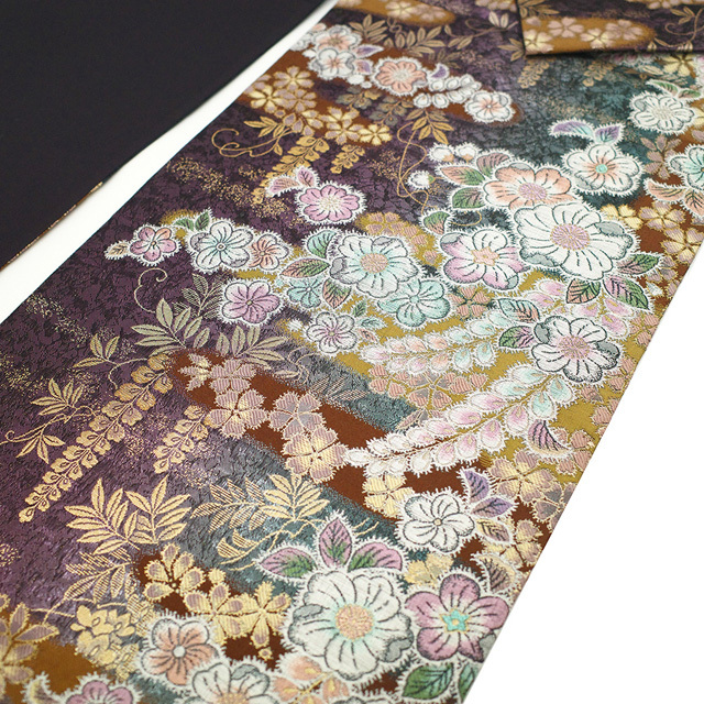 袋帯 フォーマル 未使用 正絹 京都 西陣 本金箔 プラチナ箔 紫 山吹茶色 薄茶色 辻が花 やまと扱い 新古品 仕立て上がり みやがわ sb54640