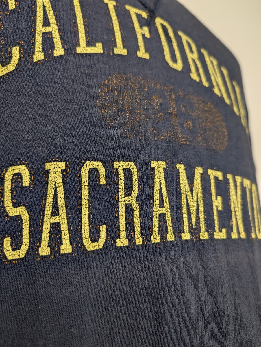 使用感あります。全体的に色落ち、プリント下部分に日焼けがあります。
