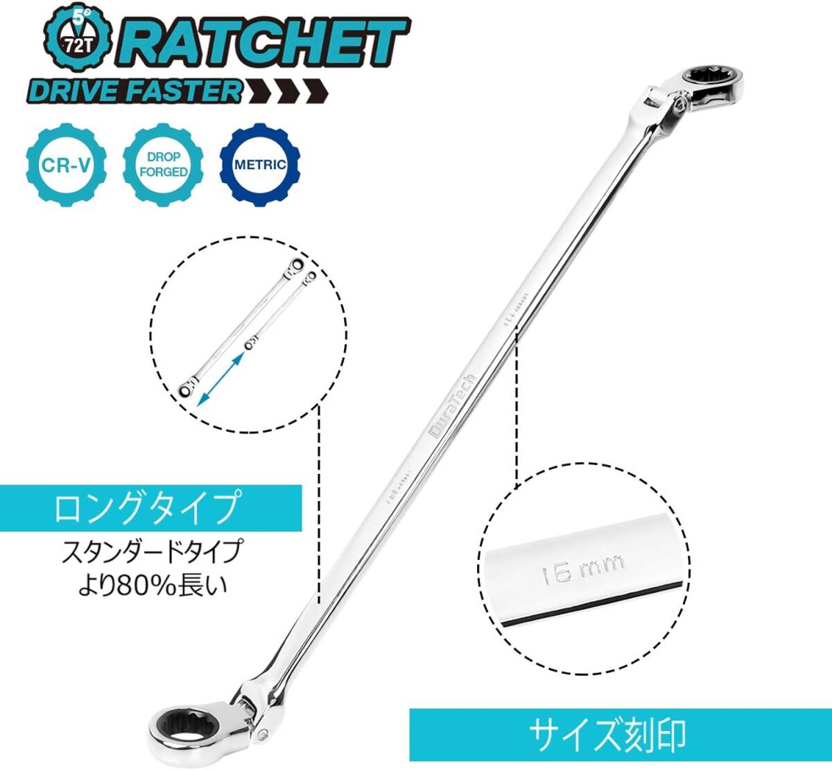 機能性重視 フレックスラチェットレンチ ロングタイプ 8~19mm 72ギア 両