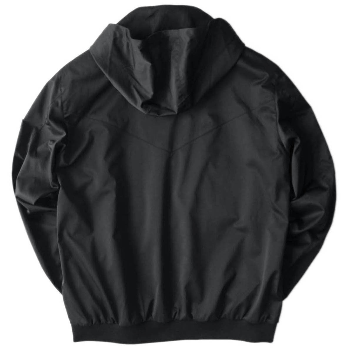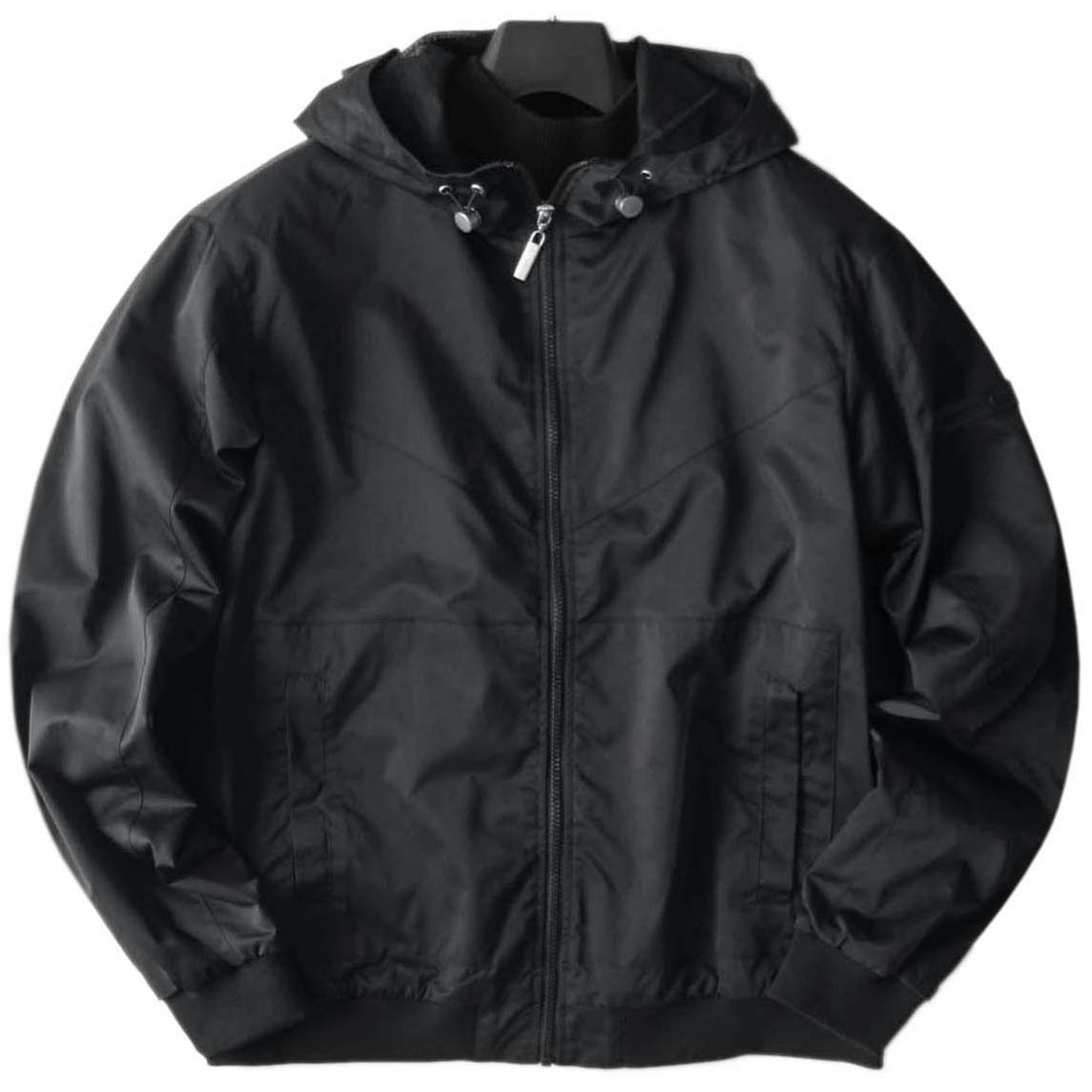 フロント開閉はファスナー(シングルジップ)、襟はフードネック、肩袖はナチュラルショルダー、シルエットは緩やかなレギュラーラインです。