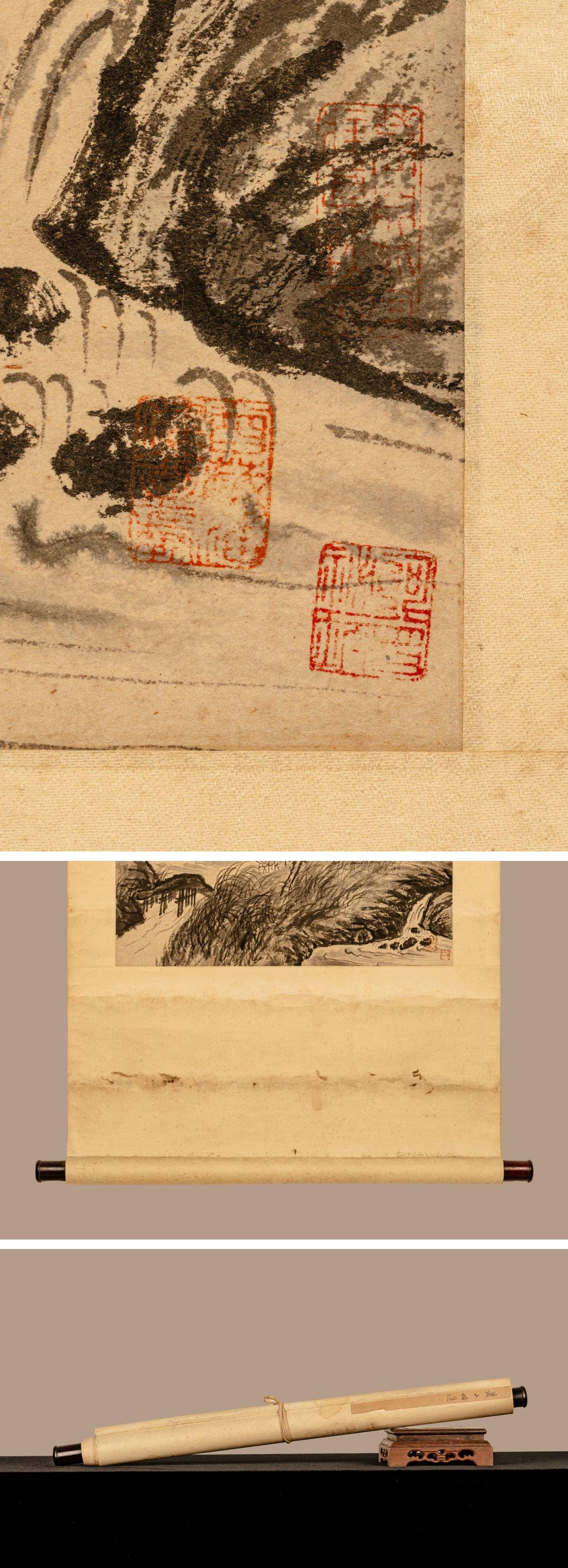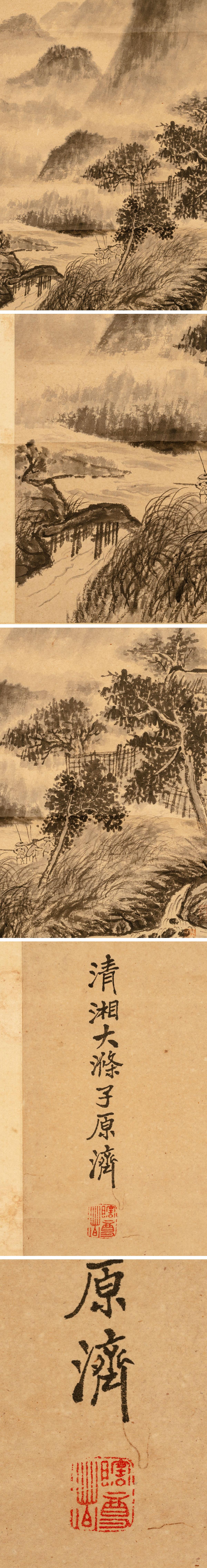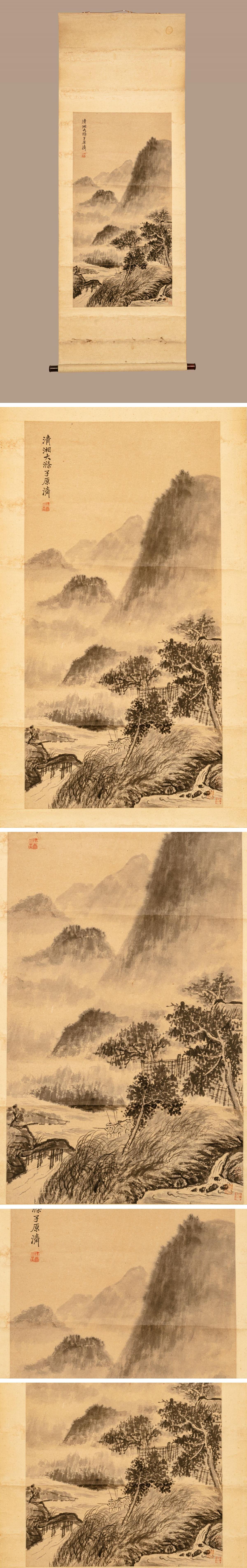 【清】中国清時代画家「石濤書」紙本「墨山水図・掛け軸」真作 巻き物 中国画 墨寶妙品 中国書画 古美味 古美術7L6-2XC7
