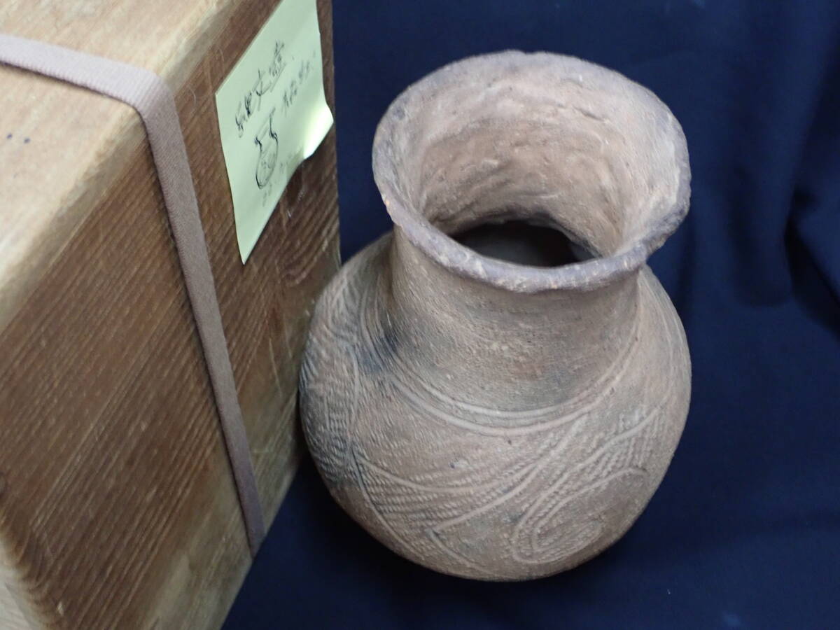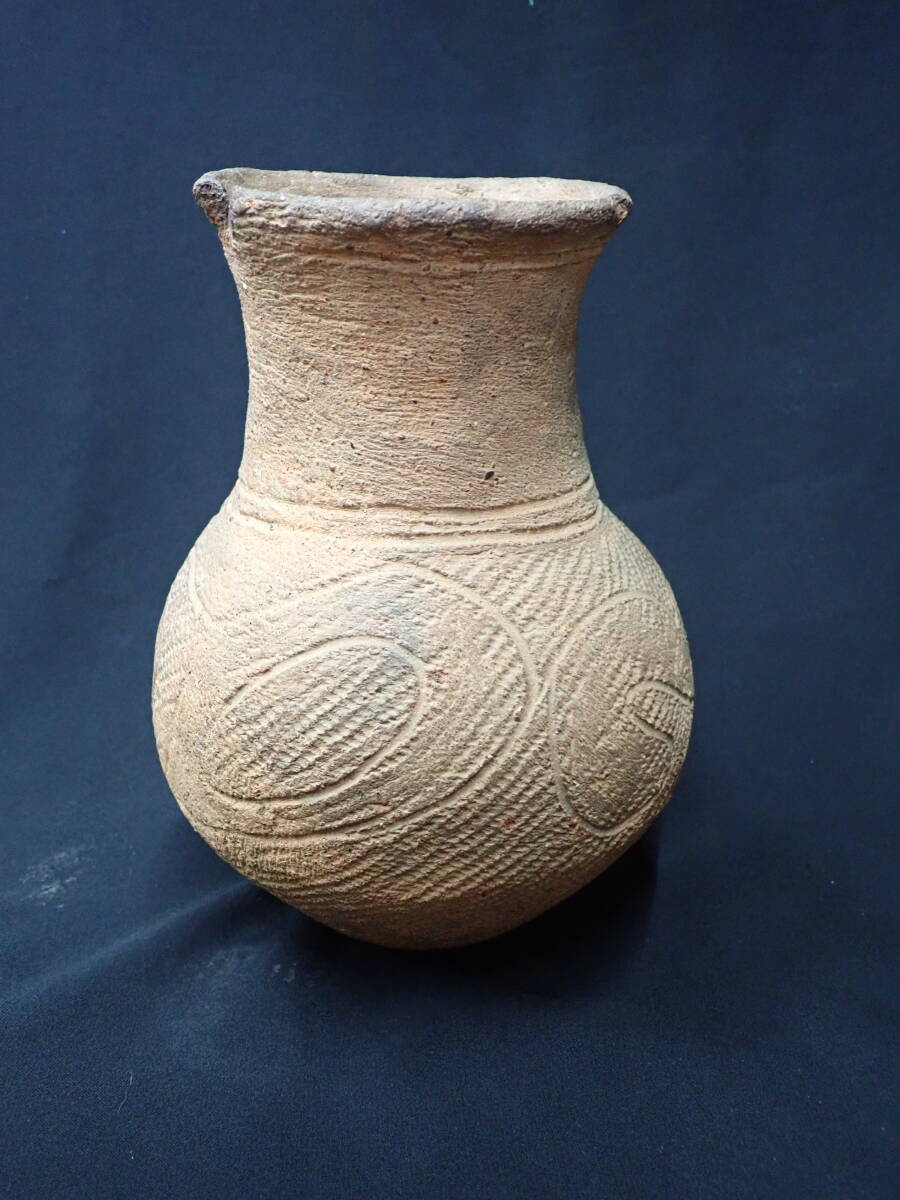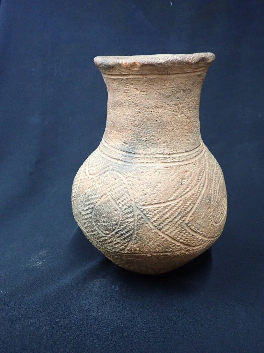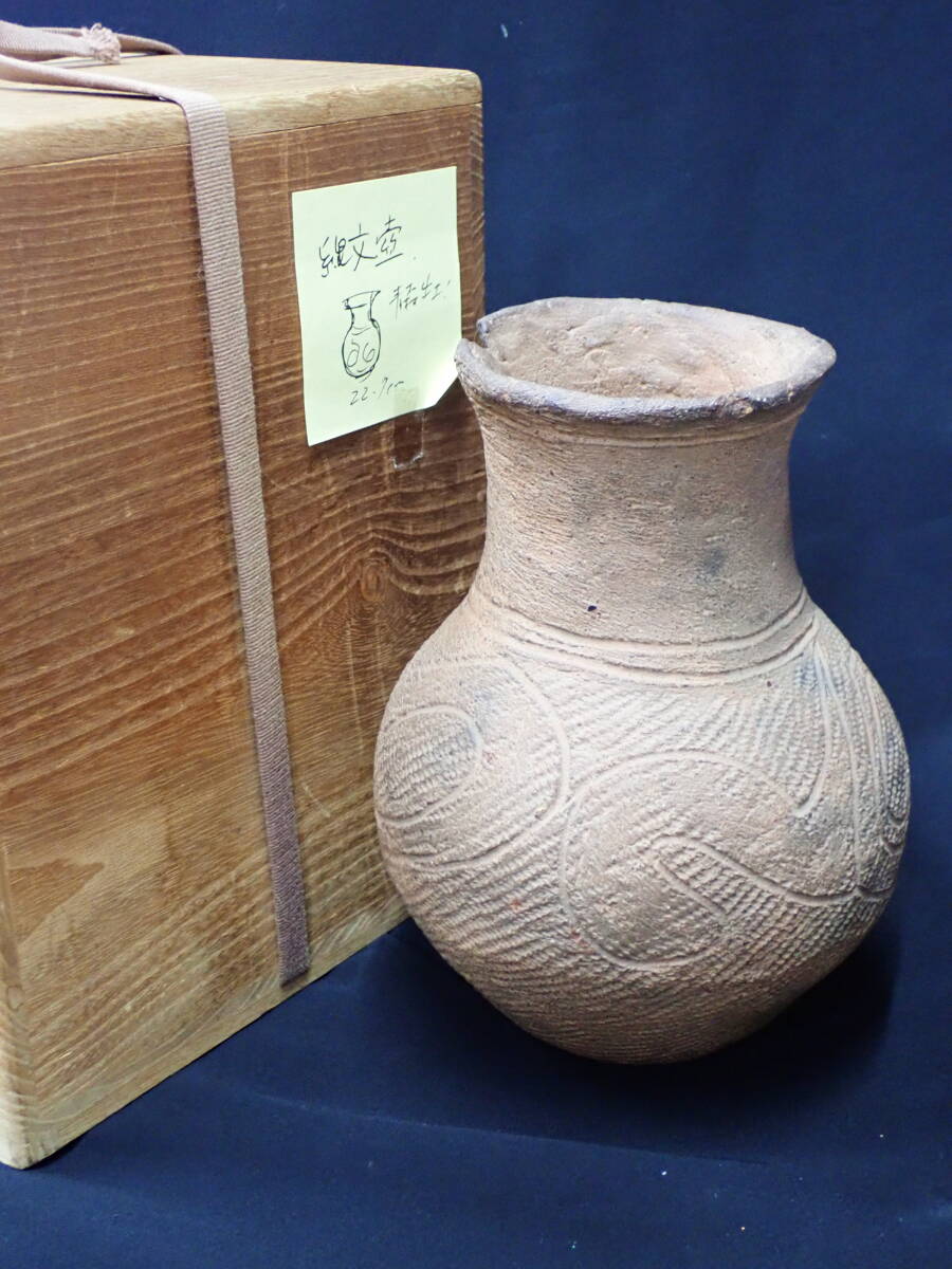 収集家放出の縄文後期の壺型土器です。間違いのないもので口周りの小さなソゲ以外割れも欠損もなく、ほぼ完全品といってよいものです。一部に朱の付着も見られます。大きさのあるこの手のものがオークションに出るのは稀なことかと思います。もちろん本物保証品です。縄文や雲形文など全体の形の残る貴重なものと思います。水を含みますと発掘物特有の土臭も致します。どうぞよろしくお願いいたします。 青森県出土 約23cm