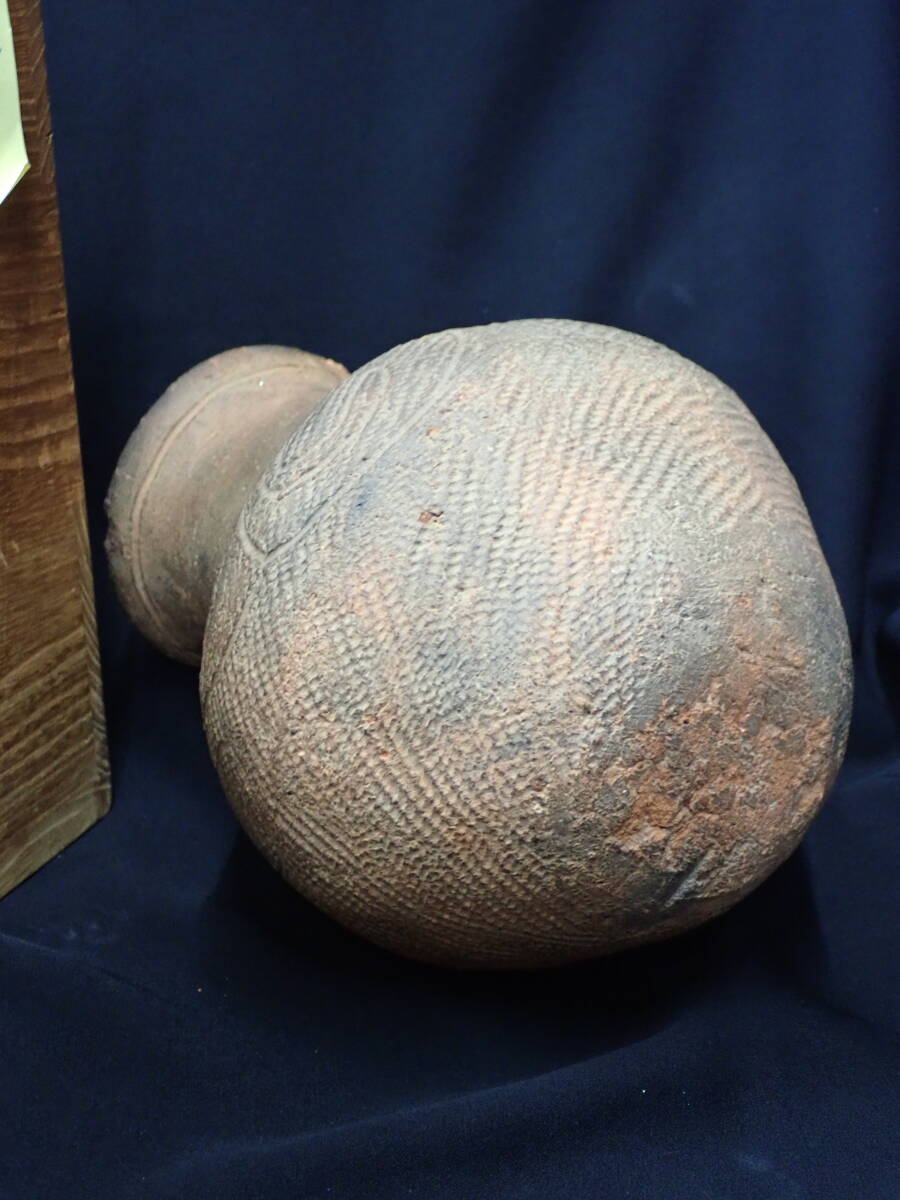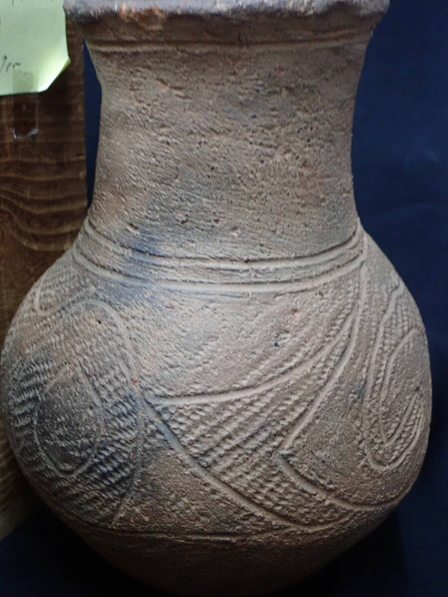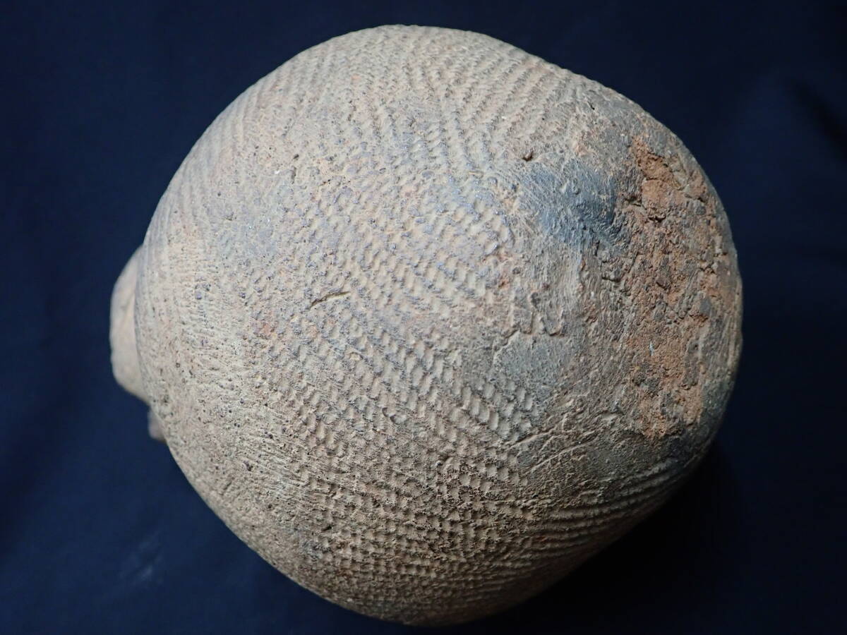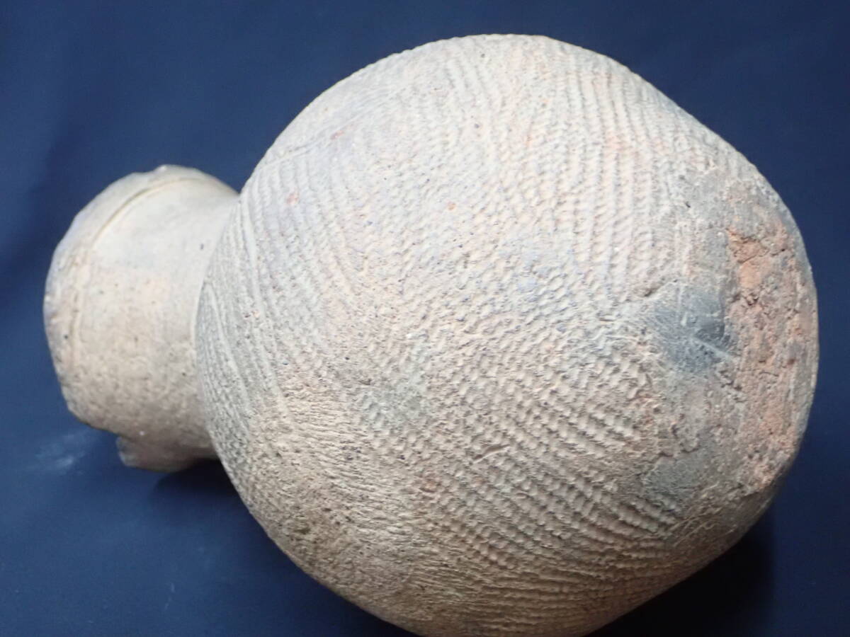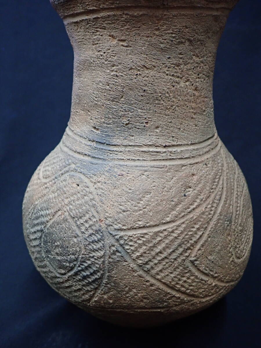 収集家放出の縄文後期の壺型土器です。間違いのないもので口周りの小さなソゲ以外割れも欠損もなく、ほぼ完全品といってよいものです。一部に朱の付着も見られます。大きさのあるこの手のものがオークションに出るのは稀なことかと思います。もちろん本物保証品です。縄文や雲形文など全体の形の残る貴重なものと思います。水を含みますと発掘物特有の土臭も致します。どうぞよろしくお願いいたします。 青森県出土 約23cm