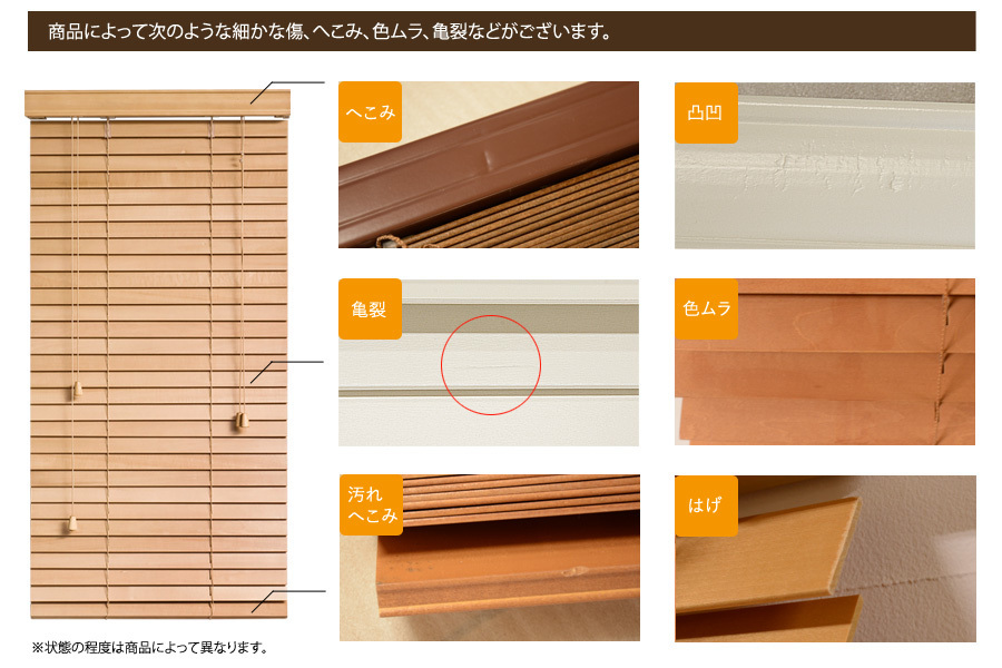 | 商品説明 | 【品番】B_WB35060150W_8 【サイズ】幅53㎝×高さ150㎝ 【スラット幅】35㎜ 【カラー】ホワイト 【参考価格】4,500円 【配送区分】A ※料金は下記にある送料の目安をご覧ください。 【サイズダウン加工】幅53cmから51cm、高さ150cmから31㎝までのご指定が可能です。 ※サイズダウン加工以外のオプション変更は出来ません。 【バランス】I型のみとなります。※バランスとは取付け部分を隠す為の前飾りです。 【状態】商品はすべて未使用品となりますが、2枚目の写真のようなキズやへこみ等がございます。商品出荷前の検品時にそのままでは出荷できないと判断された、訳アリ品となります。使用上には問題はございませんのでご安心くださいませ。 【色味】天然素材という特性上、一点一点色合いや艶の具合が異なります。色味のご指定はできません。現品のみの販売となります。 |