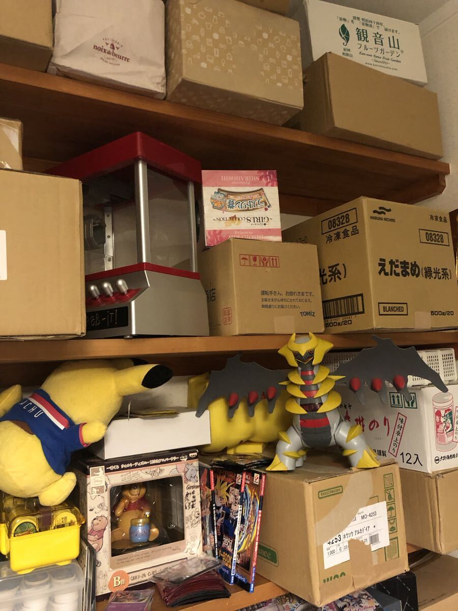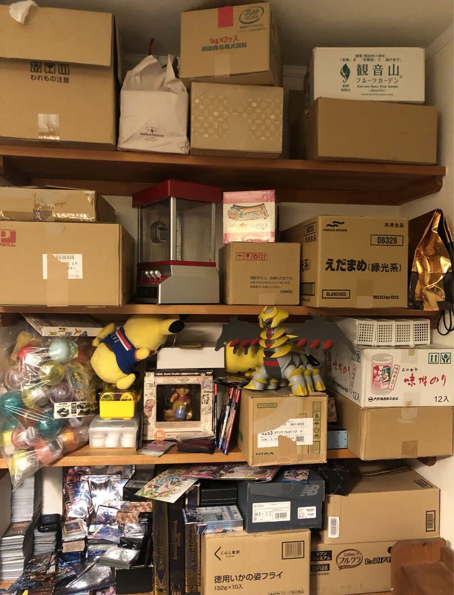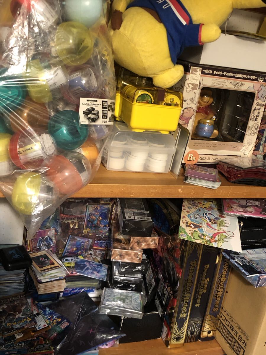 かなりの量で、写真1枚目の棚に乗っている物が全てとなります(ダンボールの中は全てサプライ、シングルカード、未開封パック、空箱、アニメグッズ、おもちゃ、ぬいぐるみなど)