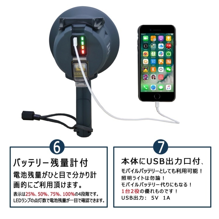 | ★オススメポイント★ 最長照射距離約900m、超遠距離タイプの登場! 光を集中させる漏斗式反射板を採用により、狭角15°配光で超遠距離900m付近まで到達! 充電式・コードレース! 電源の取れない場所でも大活躍! 点灯時間最長8時間!夜間作業を強力サポート! 多機能設計! 折り畳み式ハンドル・グリップ・ストラップ・三脚取付穴付 使用場所によって手持ち・手提げ・吊り下げが可能! 市販の三脚にも対応! グリップの滑りにくく持ちやすい形状に加え、僅か0.7kgの重さで扱いやすい設計 ※三脚は付属しておりません。別途お買い求めください。 高品質・高輝度 OSRAM製(ドイツ)LEDチップ3灯搭載! 高効率5WLEDチップ3個を搭載し、脅威の明るさ1500lmを実現! スイッチ一つで点灯4モード切替可能! HIGH・MIDDLE・LOW:用途・場所などによって使い分けが出来る SOS:モールス信号のSOSサイン もしもの時に! 点灯パターンHIGH→MIDDLE→LOW→SOS→OFF バッテリー残量計付 電池残量がひと目で分かり計画的にご利用頂けます。 表示は25%、50%、75%、100%の4段階です。 LEDランプの点灯数で電池残量が一目で確認できます。 本体にUSB出力口付、モバイルバッテリーとしても利用可能! 照明ライトは勿論! モバイルバッテリー代りにもなる! 1台2役の優れものです! USB出力: 5V 1A 安心の防塵・防水設計! IP65防塵防水仕様となっており、突然の雨も安心! 雨の当たる屋外や粉塵の多い環境でも安心・安全にご使用頂けます。 使用範囲 鉄道・海上作業·救援・自衛隊町内会など緊急事態の誘導照明などとしてお役立て致します。 高所・下水道・鉄道・地下鉄・トンネルなどの点検作業 灯台・漁船の信号灯としてもお勧めです。 |