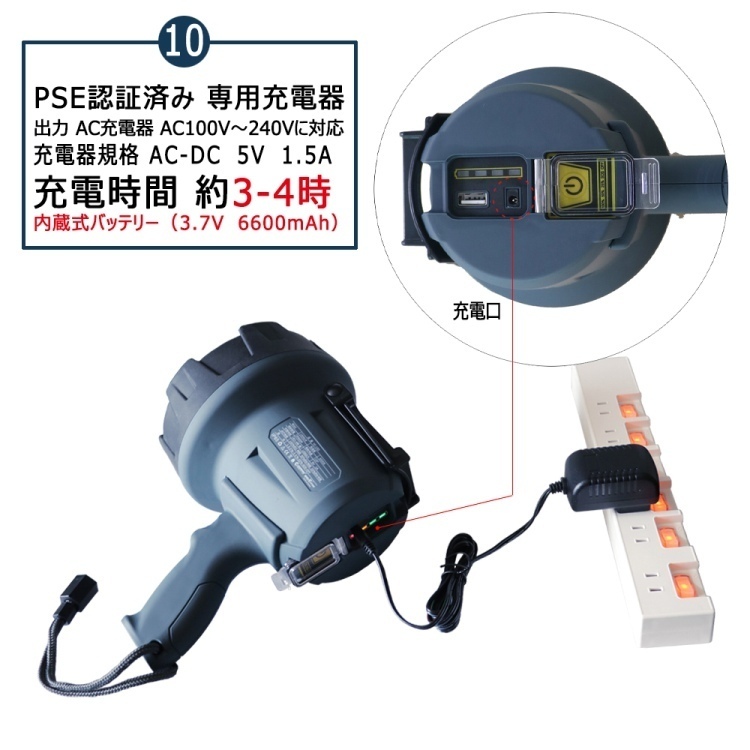 | セット内容 | サーチライト本体(ストラップ付属)、AC充電器、保証書、取扱説明書 | ||