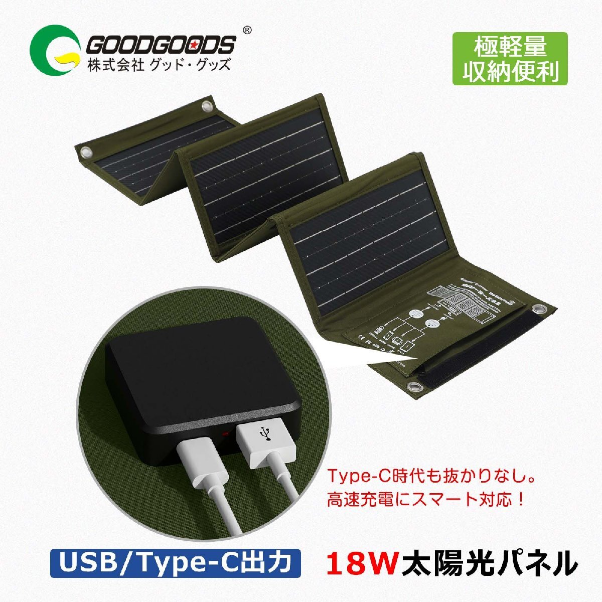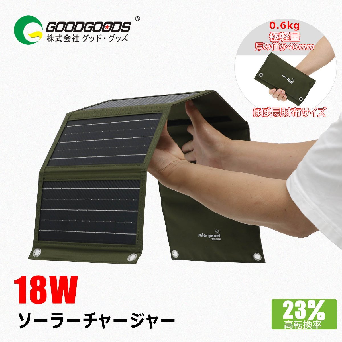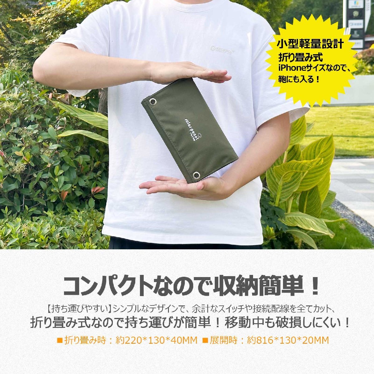![]() ![]() ![]() ![]() ![]() ![]() ★オススメポイント★ 【圧倒的な軽さとコンパクト性が魅力】 僅か600gと軽量で、長財布ほどのコンパクトサイズ! 展開すれば5枚の単結晶高効率シリコンパネルでしっかり発電します。 【スマホ・タブレットに使える!USB/Type-C出力!】 汎用性が高い、USB-AとType-Cの出力ポートを搭載! 広く使われる2種類で、スマホ・タブレットなどに対応行だけで充電が可能です。 【吊下げて使える!カラビナフック2個付属!】 便利なカラビナフックが2個付属しており、ソーラーパネルを簡単に取り付けできます。 キャンプではテントに、移動中はリュックに吊るして、さまざまな場所で発電・充電が可能です。歩きながらでも手軽に利用できます 【バッテリーの内蔵なしで保管も便利!!】 劣化の不安や管理、安全面への配慮が必要とされるバッテリーを搭載していないから、避難グッズとしても、普段の便利グッズとしても保管・持ち運びに最適です。勿論、飛行機などでの移動時も持ち運び頂けます。 【ソーラーパネルの活用で再生可能エネルギーの第一歩!】太陽光を利用した発電は、持続可能で環境に優しいエネルギー源。無限に供給される太陽光で、温室効果ガスの排出を抑え、持続可能な社会の実現に貢献します。