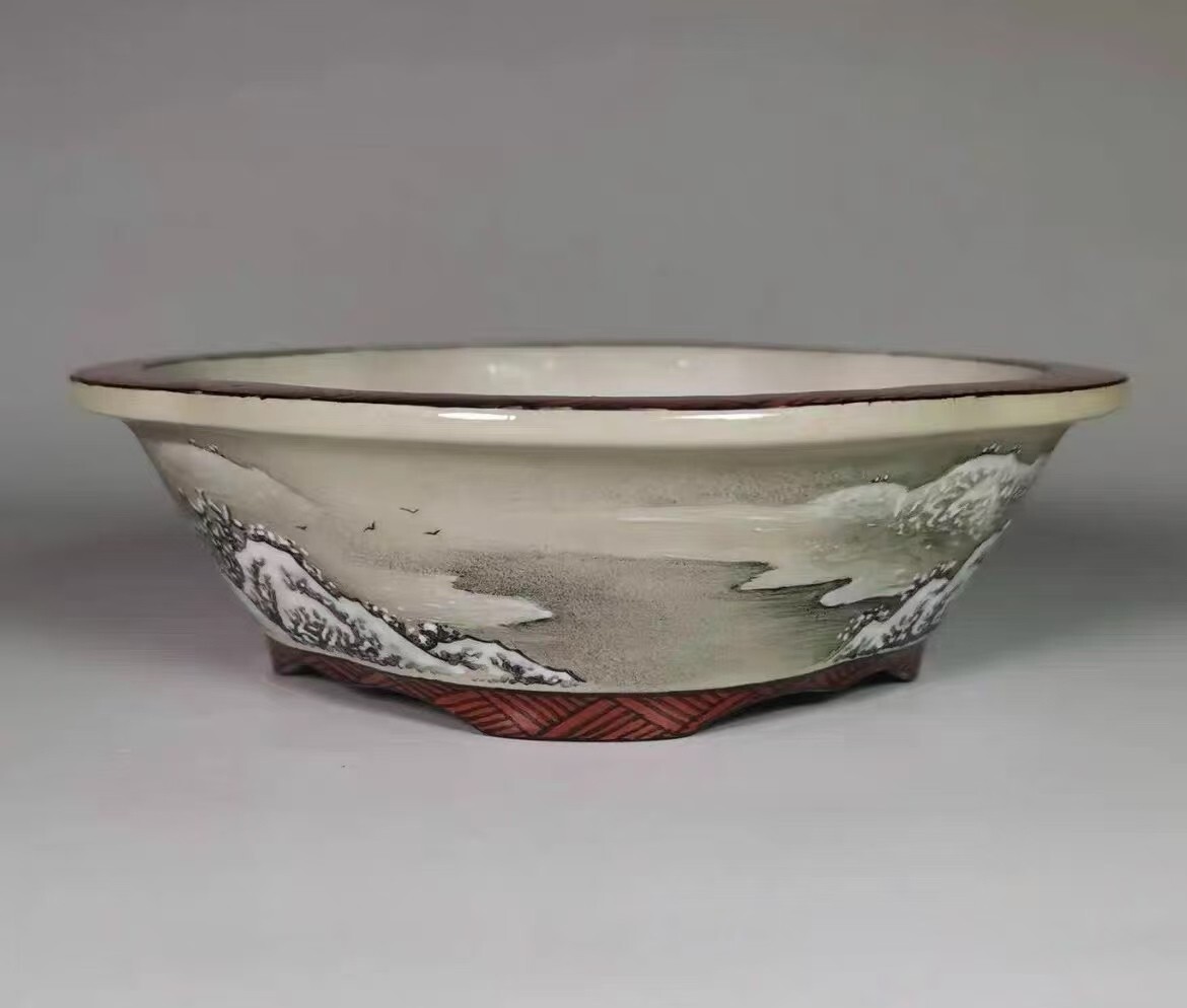 この海棠鉢は、小さな観葉植物や豆盆栽(マメぼんさい)と組み合わせることで「冬の山水が広がる静謐な小景観」を演出できるだけでなく、単体で飾るだけでも、和室やリビングといった空間に「伝統工芸の精緻さと雪景山水の美」をアクセントとして加え、穏やかで心癒やしのある空間を創り出します。