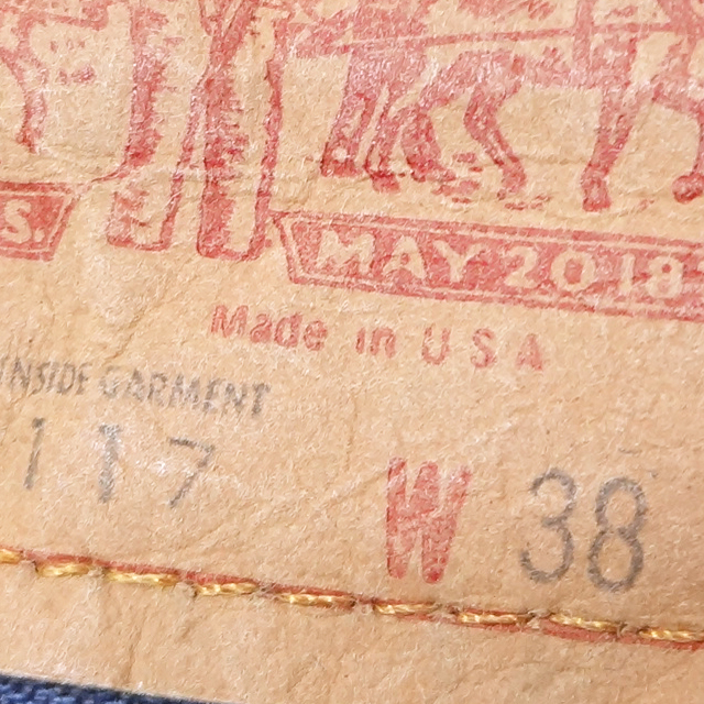 ・ビックEレッドタブ、アーキュエットステッチ、MADE IN USA表記入りペーパーパッチ、バータック、ボタンフライ、5ポケットリベット、赤耳、チェーンステッチ