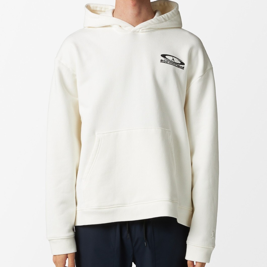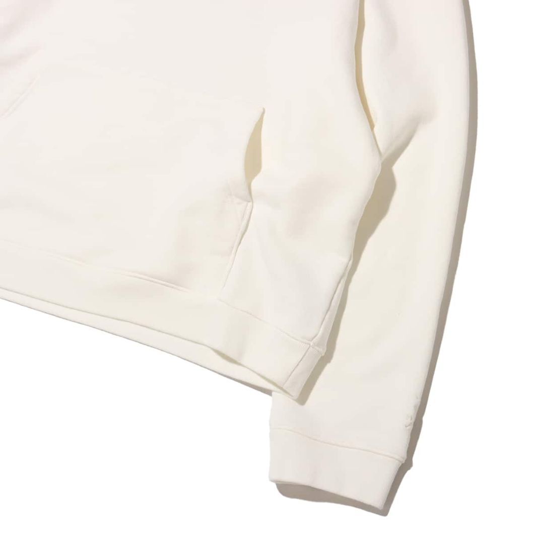 厚手のスウェットを使用したパーカーは、重ね着アイテムとして快適に着こなせる。