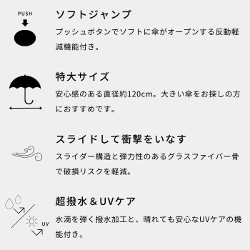 | 開いた時の反動が優しく、大きさも強さも頼もしいジャンプ傘です。 ■注意事項 ・製品には尖った部分があります。常に周囲の安全を確認してご使用ください。 ・手元または骨の先端が壊れたまま使用しないでください。 ・振り回したり投げたりしないでください。 ・豪雨強風時は破損する恐れがありますので使用しないでください。 ・基準を超えた雨量によっては雨漏りする場合があります。 ・傘骨の構造部に手を触れないでください。 ・傘生地は色落ちする場合もありますので乾燥が充分でない傘を服その他の物に接触させないでください。 ・自転車運転中は使用しないでください。 ・お子さまの使用時は保護者の方がご注意ください。 ・沖縄、離島は別途追加送料が必要になる場合がございます。 ・製品の色調は、お客様のご使用のモニターやブラウザ等の環境により、実物と異なる場合がございます。 |