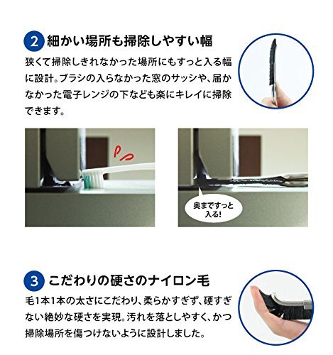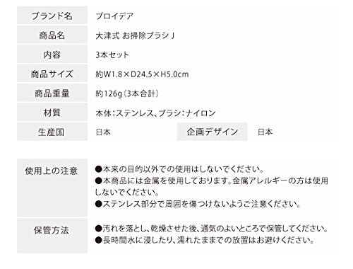 「PROIDEA(プロイデア) 大津式 お掃除ブラシ J(3本組) ブラック W1.8×D23.5×H5.0cm」▼4531661068604▼(商品説明)・ブラック W1.8×D23.5×H5.0cm 0070-3567-00・掃除しにくい部分を効率よくきれいに!・【商品サイズ】 約W1.8×D24.5×H5cm・【重量・内容量】 126g・【原産国】 日本PROIDEA(プロイデア) 大津式 お掃除ブラシ J(3本組) 掃除しにくい部分を効率よくきれいに! 細かいところ(今まで掃除が出来なかった場所・気が付かなかった場所・敬遠してきた場所)を重点的に掃除できるブラシ(br)掃除しにくい「角」「隙間」などをしっかりと掃除することが重要。この商品はその掃除しにくい部分を効率よくきれいにすることを目的に考え抜いた商品。(br)(1) 先端が「Jの字」になっているので今までの掃除ブラシでは届かなかった場所も掃除できる。(br)(2) ブラシの毛1本1本の太さにこだわり柔らかすぎず、硬すぎずの絶妙な硬さに設計。(br) (汚れはとれるが掃除場所を傷つけない硬さ)(br)(3) 細かい(狭い)場所を掃除できる幅に設計。(br)(4) 指ストッパーを付けることでブラシに力を伝えやすくなり、素手感覚で掃除できる。(br)(5) 持ち手に輪を作り収納もしやすい(にぎりやすい形状)。(br)(6) ステンレスせいで錆びにくく丈夫な作り。(br)(7) 日本国内で職人の手作業で製作されたもの。(br)◆耐久性も抜群!(br)ブラシの素材に66ナイロン(通常のナイロンよりも強度・耐熱性、また耐油性、耐摩耗性、潤滑性においても優れています。