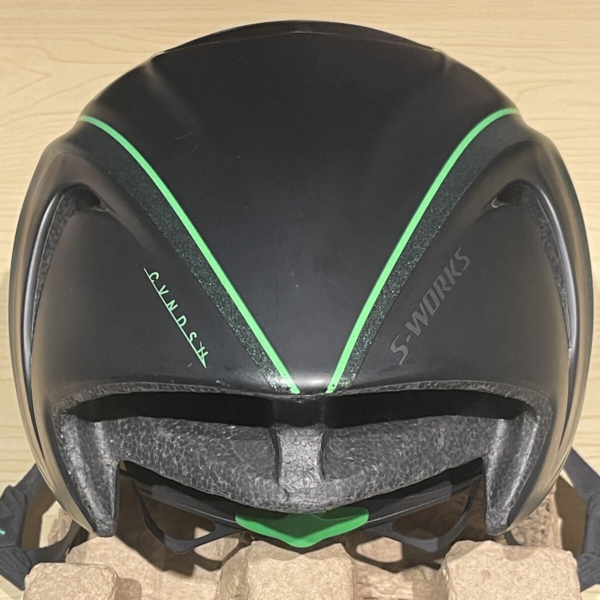 CVNDSH コレクション ヘルメット は S-WORKS イヴェード をベースにしたロードレース用ヘルメット。前後方向に長く、後方に向かってすぼまる独特の形状とインテークを少なくすることによってエアロダイナミクスを追求している。