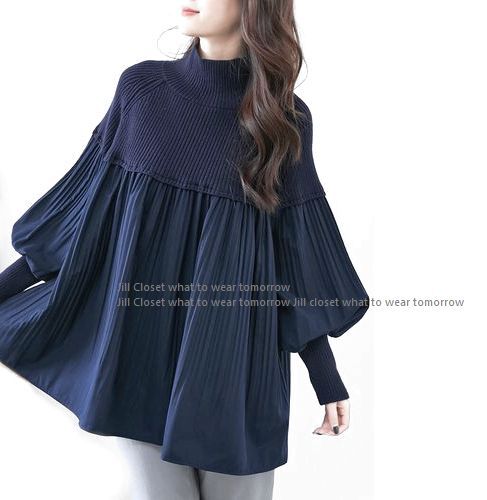 新品【送料185円】NAVY 伸縮◎リブニット×プリーツ加工ブラウス*異素材切り替えdesign*ハイネック プルオーバー*チュニック3167
