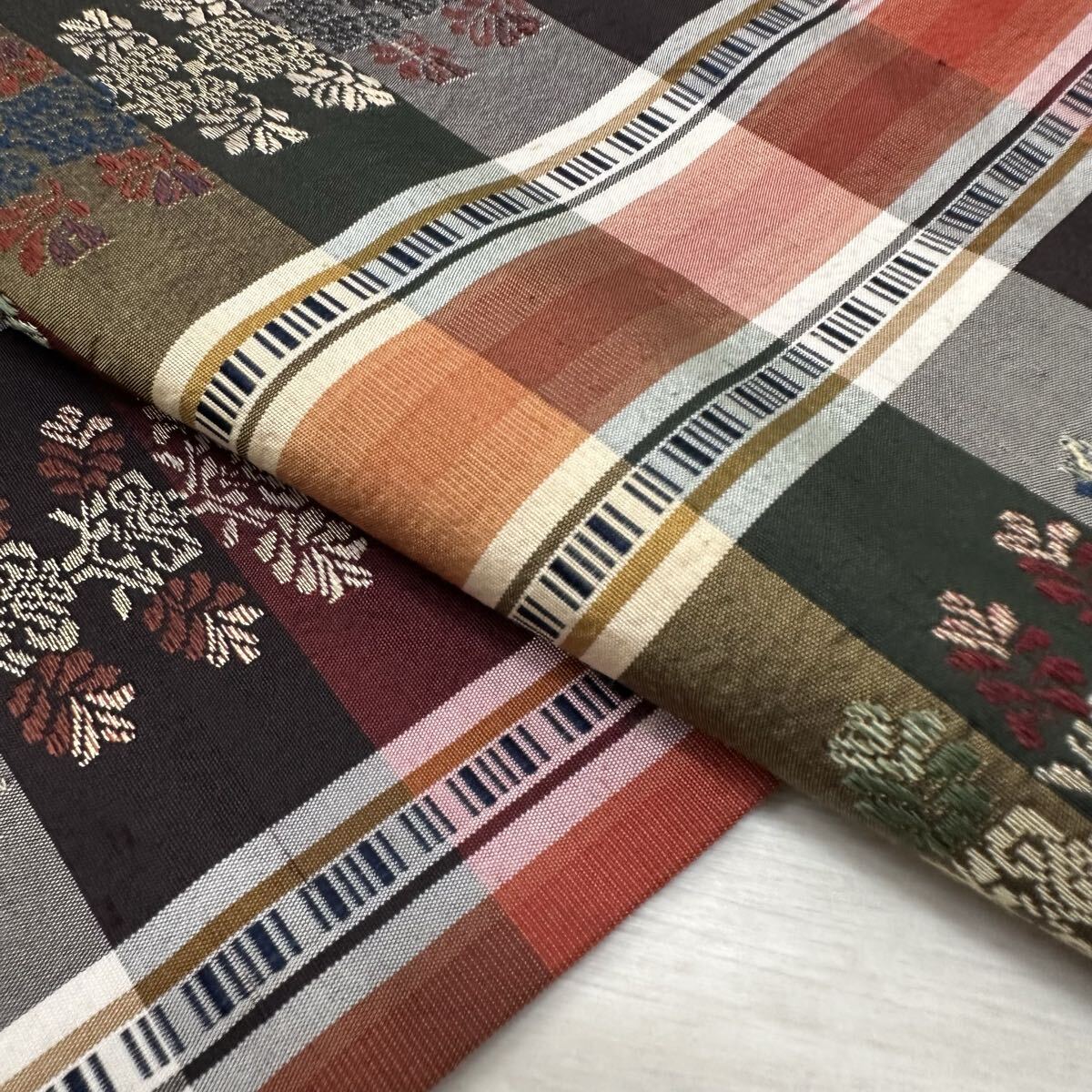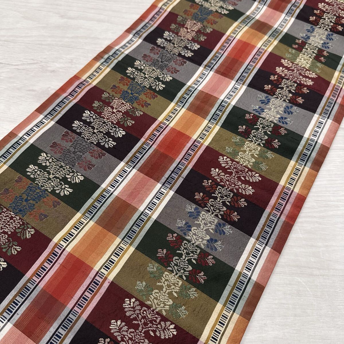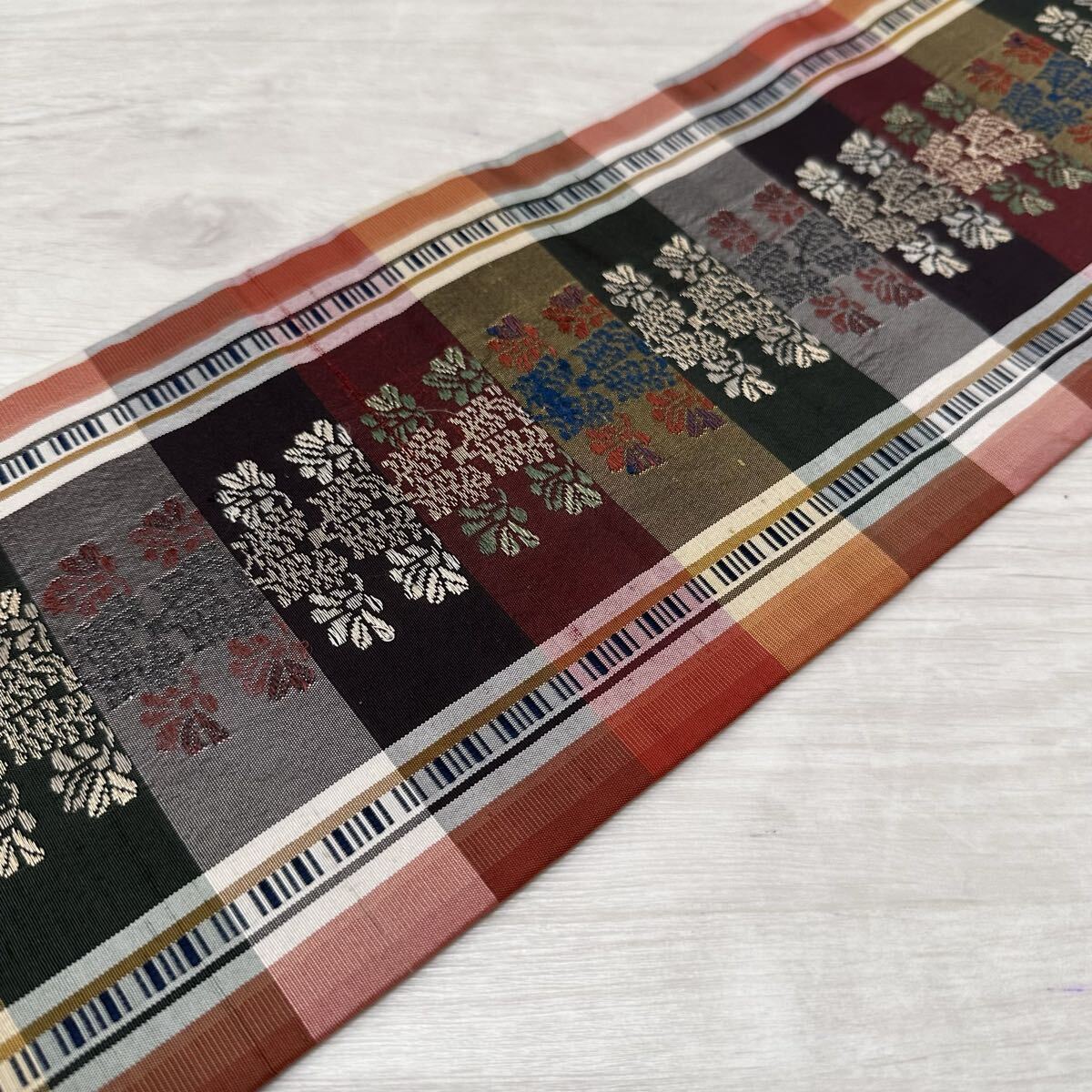名古屋帯 カラフルな格子柄 唐織の草花模様 九寸 正絹 着物 Q-076