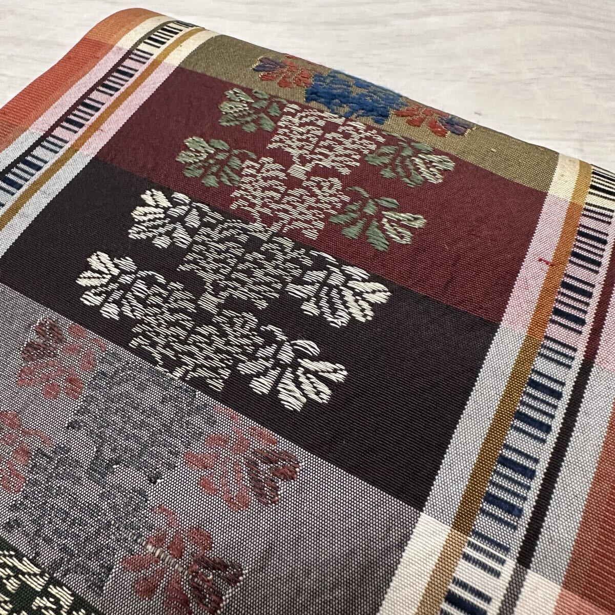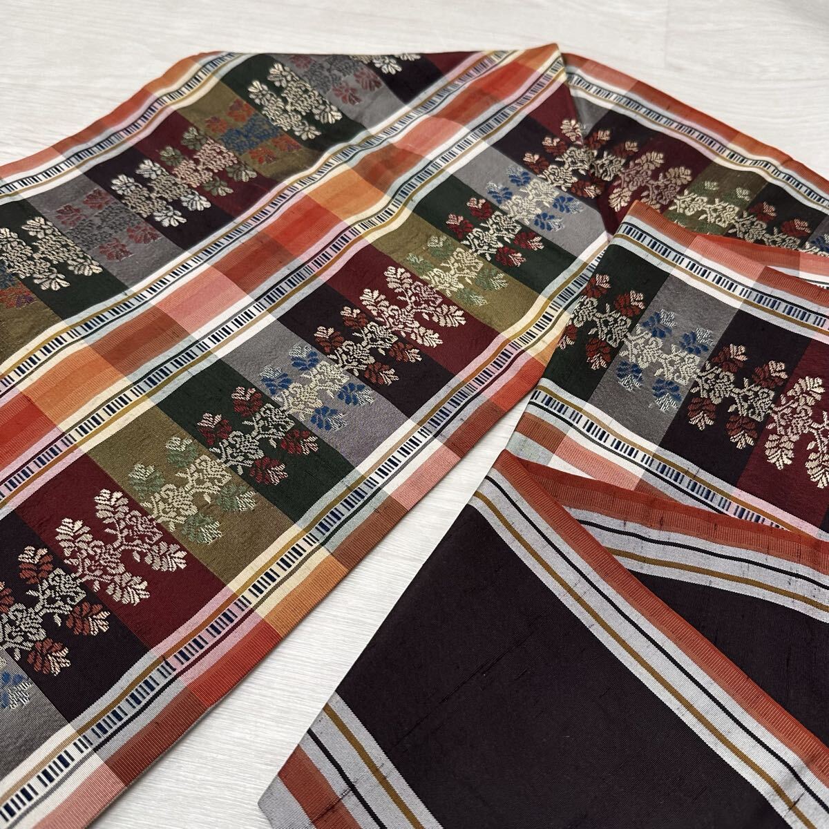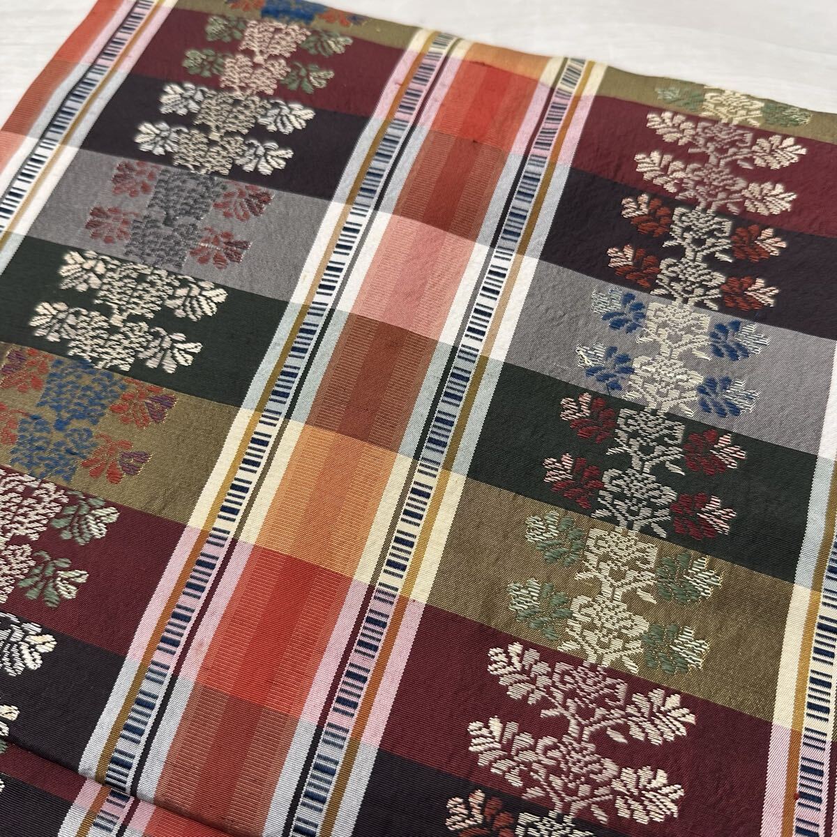 名古屋帯 カラフルな格子柄 唐織の草花模様 九寸 正絹 着物 Q-076