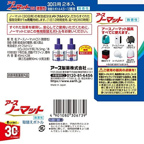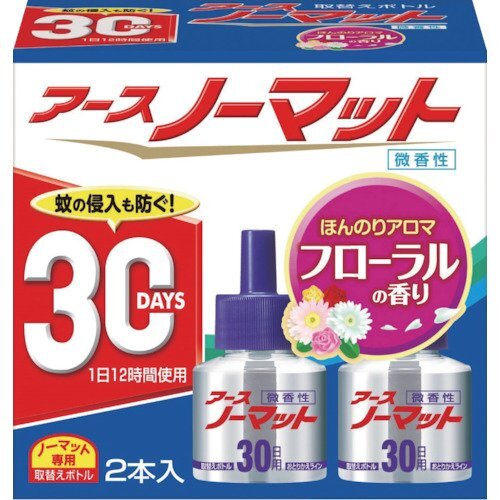 商品紹介 器具を長年(7~8年)使用すると、経年劣化を起こす可能性が高くなります。長年お使いくださった器具は、新しい器具に交換してください。液体蚊取は、有効成分と芯とリングヒーター温度の組み合わせが各メーカーによって異なります。アースノーマットボトル以外のボトルを使用した場合の有効性、安全性は確認しておらず、また、発火等火災の危険を生じるおそれがありますので、アースノーマットボトルは、必ずアースノーマット専用器具でご使用ください。万一、誤った使用方法によって生じたトラブルには、責任を負いかねますので、あらかじめご容赦ください。 電源コードに重いものを載せたり、機器にはさまないでください。 【器具の取り扱い・保管上の注意】 ● 家庭用100Vの電源で使用すること。● 器具に針金やピンなどを差し込まないこと。また、ぬれた手で器具に触れないこと。 器具の分解・修理・改造は、事故や故障の原因となるので、絶対にしないこと。● コードを無理に引っぱったり、コードを持って器具を運んだりしないこと。水・洗剤・クリーナーなどは使用しないこと。● 器具の汚れやほこりをふき取って、ポリ袋などに入れて保管すること。● 電源コードは交換することができません。コードが破損した場合は、器具を廃棄すること。【相談すること】● 万一身体に異常が起きた場合や、液を誤って飲み込んだ場合は、直ちに本品がピレスロイド系の殺虫剤であることを医師に告げて、診療を受けること。【その他の注意】 ● 定められた使用方法・使用量を必ず守ること。 ● ボトルの芯には薬剤が付いているので直接手を触れないこと。万一、皮膚に薬剤がついた場合は、石けんを用いてよく洗うこと。● 閉めきった部屋や狭い部屋で使用する場合は、時々注意して部屋の換気をすること。体質や体調によっては頭痛、のどの痛み、不快感などの原因となります。● アレルギー体質の人は使用に注意すること。● 器具に針金やピン等を差し込んだり、ぬれた手で器具に触れたりしないこと。また、器具やボトルに水・油等の液体をかけないこと。感電や故障の原因となります。● 使用中、器具上部や蒸散口は熱くなるので、手で触れたり、中に指を入れたりしないこと。特に子供の指は入りやすいので気をつけること。やけどの原因となる恐れがあります。● 使用中及び使用後は、子供の手に触れさせないこと。● 器具は正常な状態で使用し、横や逆さにしたり、吊るして使用しないこと。また、器具を落としたり、衝撃を与えないこと。● 火気に注意し、直接炎を近づけないこと。● 器具の上に新聞、ふとん、毛布、衣類などをかけないこと。熱がこもってコゲたり、器具が変形することがあります。● 液漏れの原因となることがあるので、直射日光が当たるところや、AV機器の上など高温になるところには置かないこと。● ボトルの芯は固定されているので、無理に引っぱったり、動かしたりしないこと。芯が折れて使用できなくなります。● まれに液の色が濃い場合がありますが、殺虫効力に差はありません。● 蒸散成分がまれにうすい白煙として見えることがありますが、異常ではありません。● 通電中は殺虫成分が連続して揮散するので、使用しないときは必ずスイッチを切ること。 ● 使用済みの空容器は適切に処分すること。【保管及び取扱上の注意】 ● 直射日光を避け、子供の手の届かない涼しいところに保管すること。 ● 3~4ヵ月以上の長期にわたって使用しないときは、ボトルを器具からはずし、キャップを締めて保管すること。残った液は、翌年も引き続き使用できます。 効果・効能:蚊成虫の駆除 お手軽1ヵ月。使い始めから終わりまで、安定した効きめで優れた殺虫効果が持続します。(1日12時間使用) 使用中を香りで知らせる、ほんのりアロマフローラルの香り。 優れた効果を確保し安心してご使用いただくために、アースノーマット取替えボトルはアースノーマット器具を必ずご使用ください。