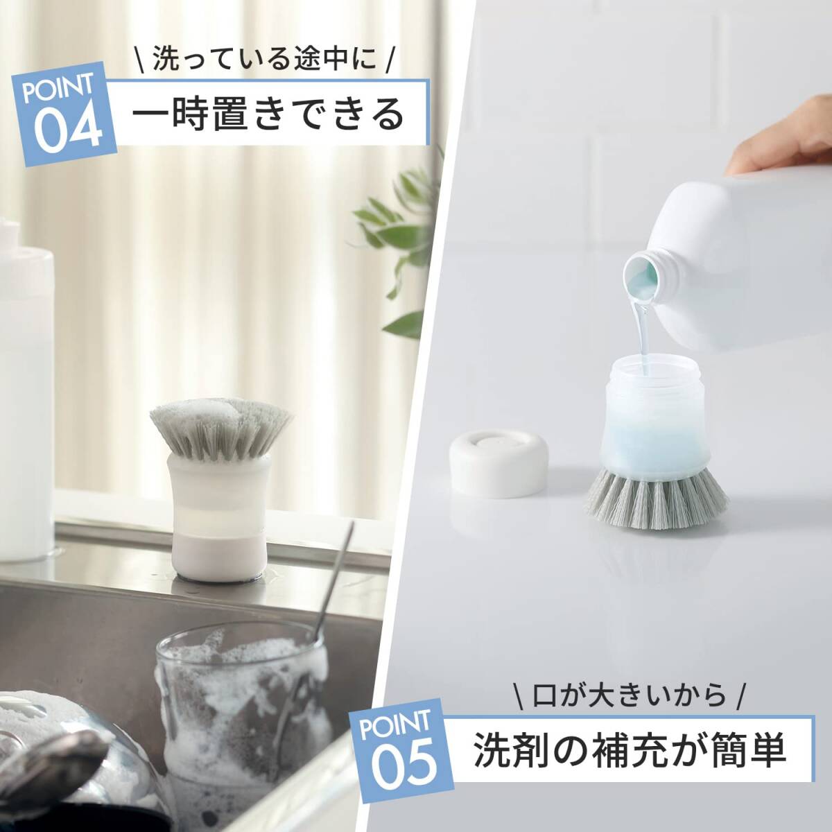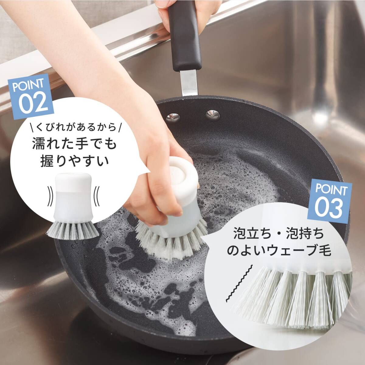 ・【しっかり握れて洗いやすい】抗菌剤入りで清潔に使えるシンプルなキッチンブラシです。先端が広がりやすく、面で洗えます。持ち手部分にくびれがあり、水や泡でぬれた手でも握りやすくなっています。洗っている途中に、ブラシ面を上にして一時置きできます。