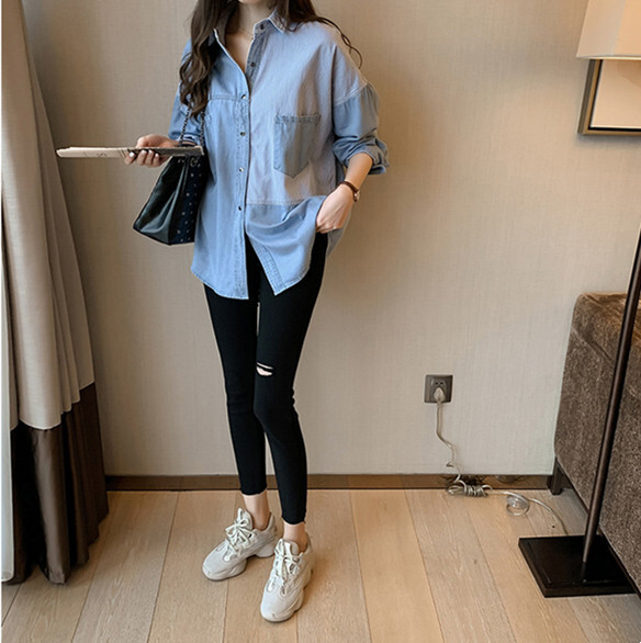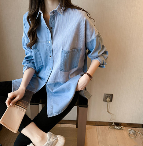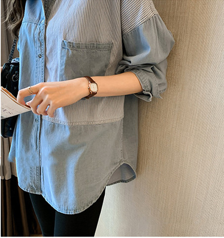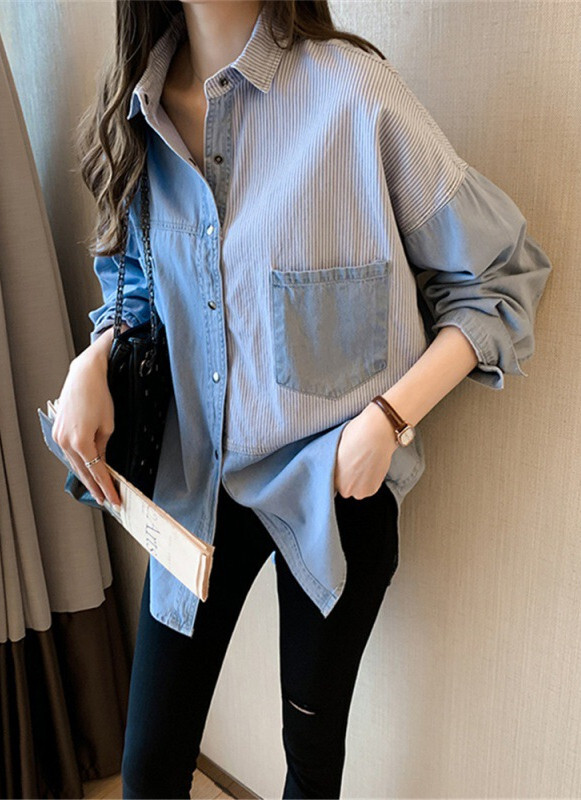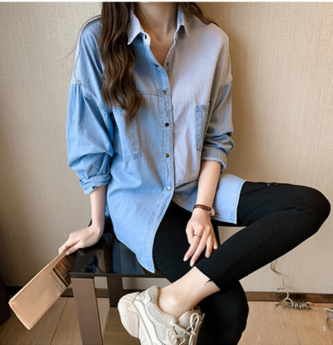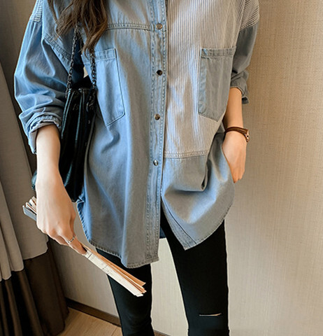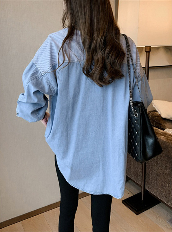 デニムシャツ レディース パッチワーク ウエスタン シャツ トップス 切替え ストライプ ゆったり ライトブルー M