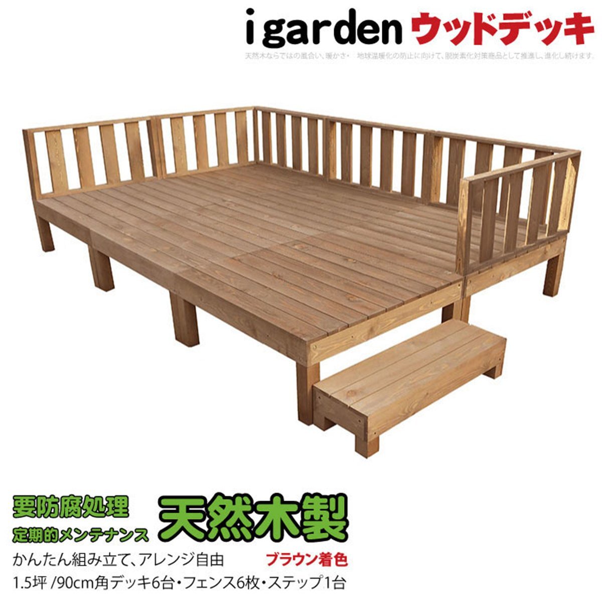igarden 天然 木製 ウッドデッキ 90×90 13点セット(デッキ6・フェンス6・ステップ1)1.5坪 ブラウン 縁側 DIY 庭 テラス -6d6f1s