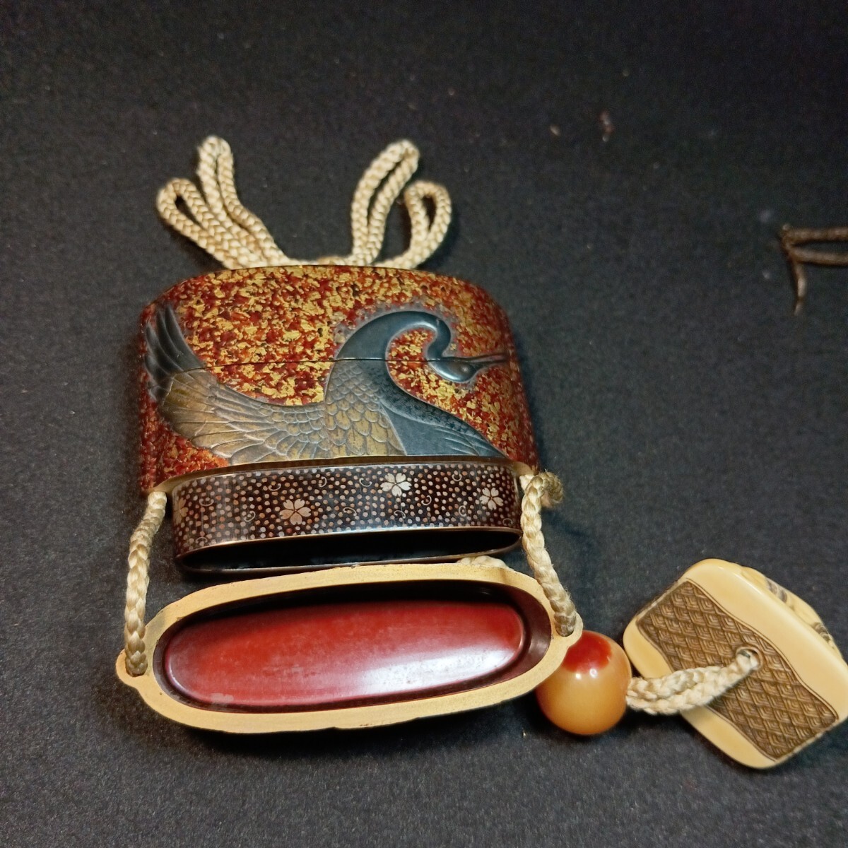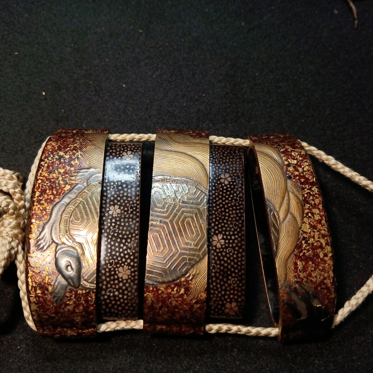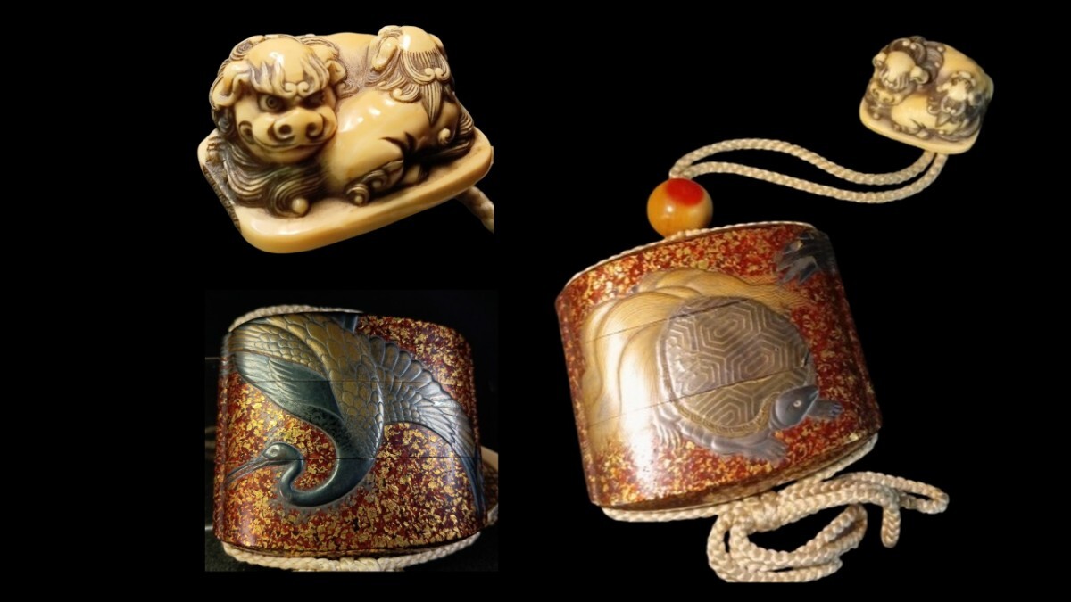 非常に 出来の良い親子の唐獅子の根付が付属した 鶴亀の図 蒔絵の印籠です 亀の甲羅の蒔絵の部分に 極小の剥がれがあります。