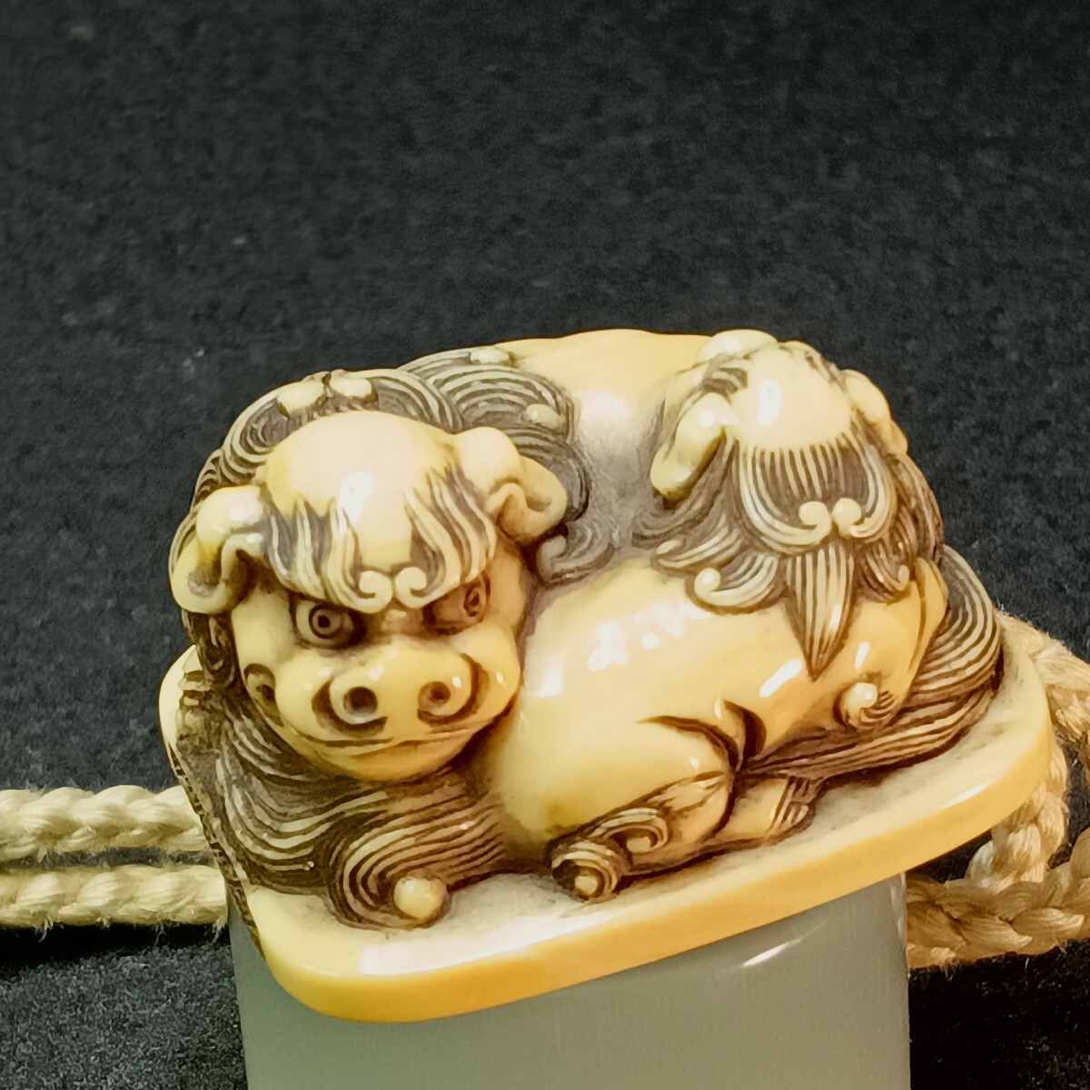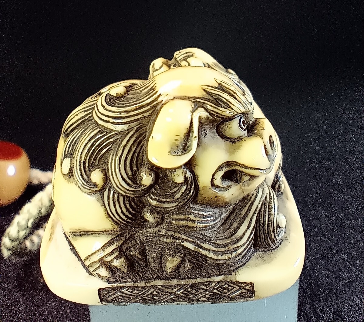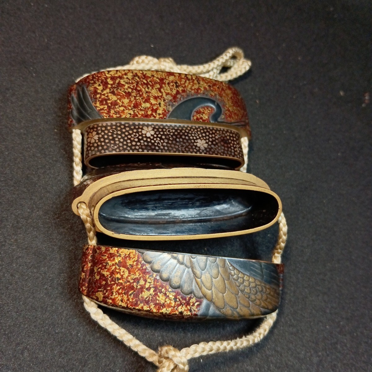 非常に 出来の良い親子の唐獅子の根付が付属した 鶴亀の図 蒔絵の印籠です 亀の甲羅の蒔絵の部分に 極小の剥がれがあります。