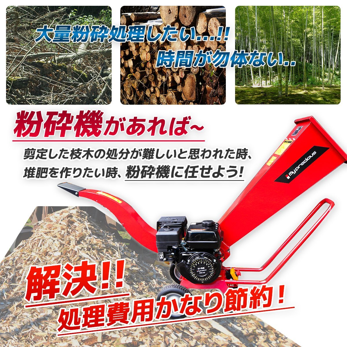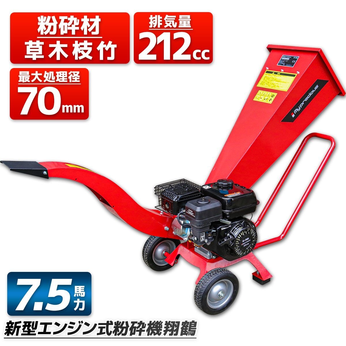 送料無料 ウッドチッパー 粉砕機 破砕機 エンジン式 7.5馬力 最大処理径70mm 強力 竹&樹木の粉砕に 1年間保証付 ガーデンシュレッダー