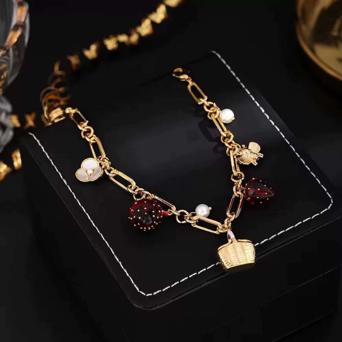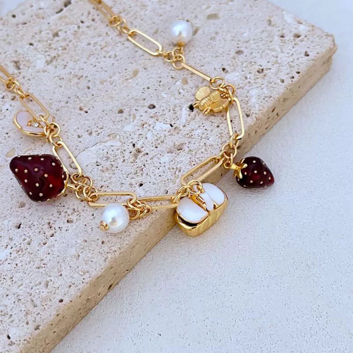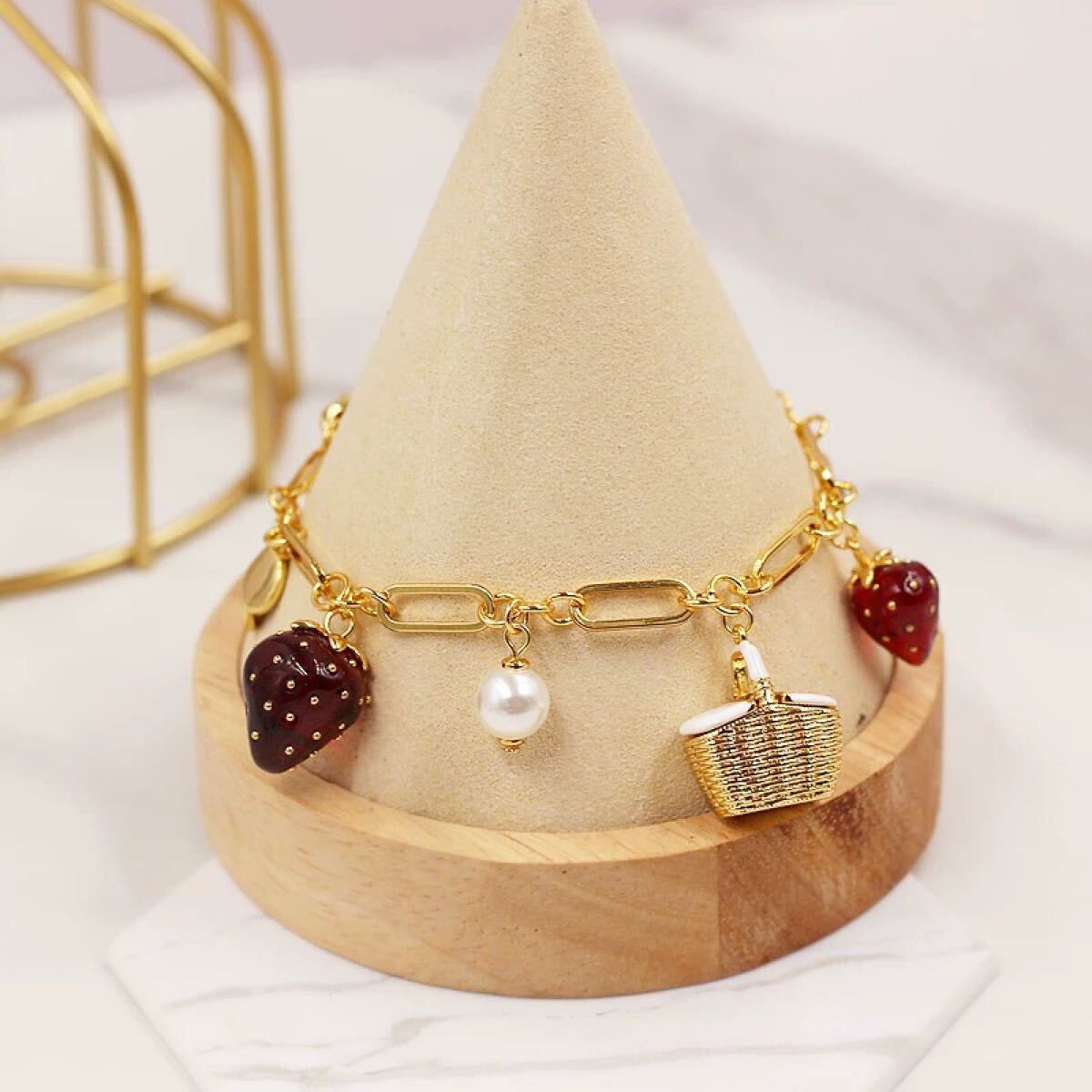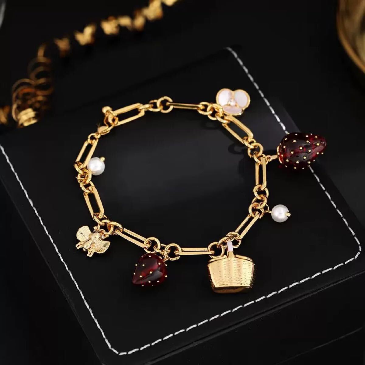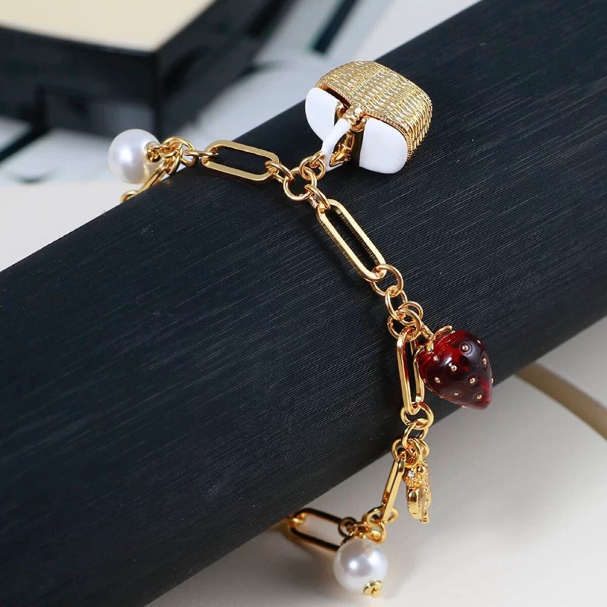 イチゴ、蜂、かごなどのユニークなチャームが、まるで物語のワンシーンを切り取ったかのような楽しさを与えてくれます。特に、イチゴの深い赤とゴールドの組み合わせが絶妙で、視線を引き付けます。