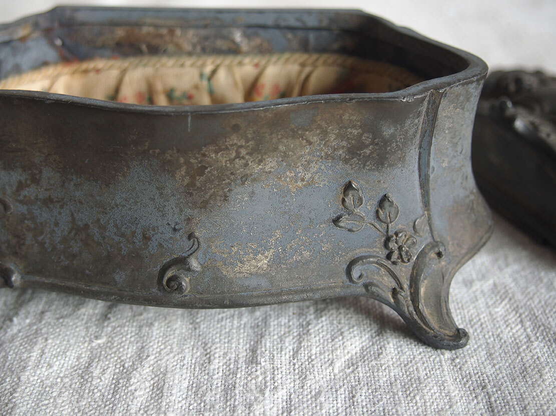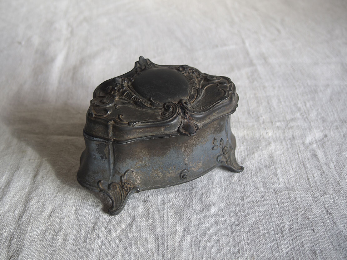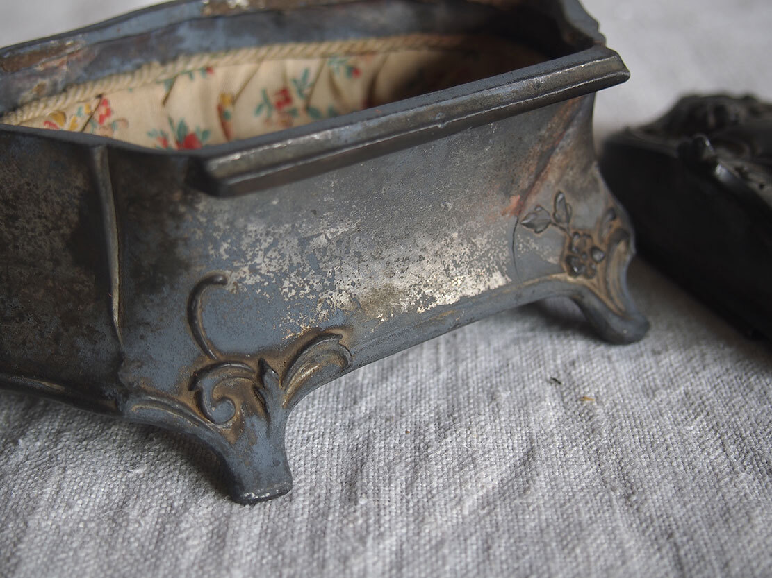 ヴィクトリアン様式 アール・ヌーヴォー ピューター 宝石箱 フレンチ ジュエリーケース 小物入れ 家具 デコレーション アンティーク/K278 ●サイズ: 高9cm×15cm×8.7cm 668g●材質:金属、絹など ヨーロッパのアンティーク市にて入手。美しい植物のレリーフの宝石箱、曲線的な装飾が特徴です。裏に "W.B. Mfg. Co" 362の刻印があります。Weidlich Brothersという会社の物のようです。蝶番の破損、本体の亀裂の修理、内部のクッションは絹、100年以上の時代を経てきたものなので、ご覧のように劣化があります。 詳細は写真でご確認いただけます。古い物だと言う事をご理解の上のご入札をお願い致します。材質及び年代の判定は困難な場合があります、差異についてはあらかじめご了承下さい。 ー ー ー ー ー ー ー ー ー 記載にない方法での発送はいたしません。 発送をお急ぎのお客様にはご希望に添えない場合があります。 ー ー ー ー ー ー ー ー ー ●その他 ヤフオクの小さな写真では商品を詳細にご覧頂く事ができません。リンク写真で質感ダメージ等の写真を数多くアップしています。必ず全部の写真がよく見える環境でご覧下さい。本商品は時代を経た古い物です。写真や説明で記載できないようなキズやシミ、古い物特有の臭いのある物もあります。できる限り詳細に説明するよう努力しておりますが、ご理解頂ける方、神経質で無い方、埃によるアレルギー等の無い方のご入札をお願いします。 必ず当店の自己紹介欄と落札後の落札通知をご覧下さい。 土曜日曜日は基本的には定休日です。メール、質問への回答は月曜日にいたします。 ご連絡は落札後48時間以内にお願いします。ご連絡が無い場合はお客様都合によるキャンセルとさせて頂きます。落札から1週間(土日祝日含む)経過してもご入金が無い場合も同様といたします。ご注意下さい。 特に評価「0」の新規のお客様、および 私とのお取り引きが初めてのお客様は遅れる事の無い様にお願い申し上げます。 評価の悪いお客様のご入札は取り消す場合があります。 入札の取り消しおよびキャンセルは固くお断りいたします。 自己紹介欄には急な連絡事項等も記載してあります、ご入札前に必ずご覧下さい。落札後には『落札通知』の内容も必ずご確認ください。 当オークションをご覧下さりありがとうございました。 Accept Paypal payment |