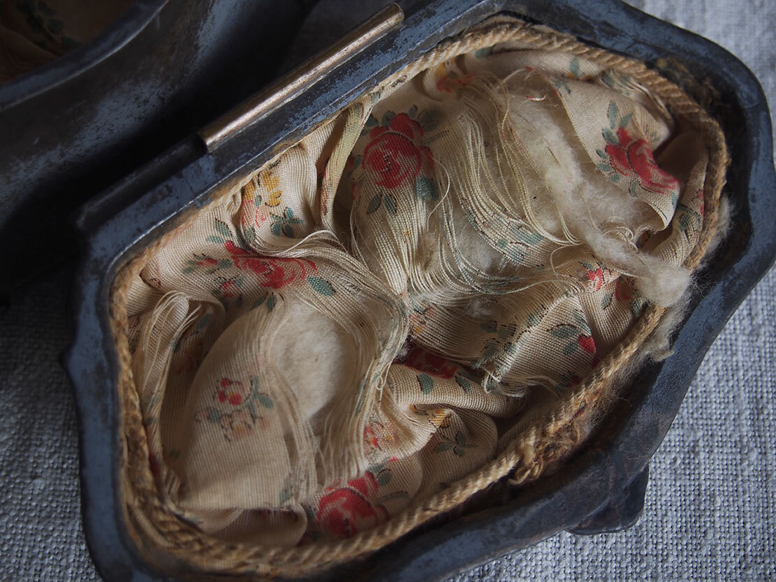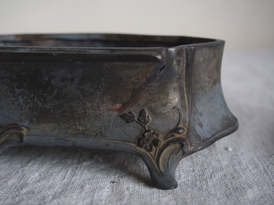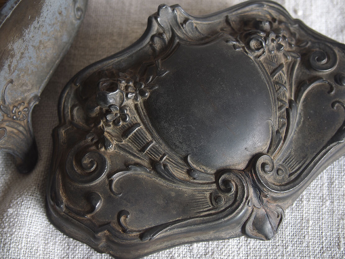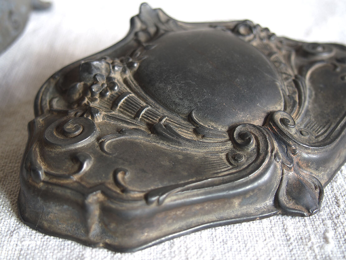 ヴィクトリアン様式 アール・ヌーヴォー ピューター 宝石箱 フレンチ ジュエリーケース 小物入れ 家具 デコレーション アンティーク/K278 ●サイズ: 高9cm×15cm×8.7cm 668g●材質:金属、絹など ヨーロッパのアンティーク市にて入手。美しい植物のレリーフの宝石箱、曲線的な装飾が特徴です。裏に "W.B. Mfg. Co" 362の刻印があります。Weidlich Brothersという会社の物のようです。蝶番の破損、本体の亀裂の修理、内部のクッションは絹、100年以上の時代を経てきたものなので、ご覧のように劣化があります。 詳細は写真でご確認いただけます。古い物だと言う事をご理解の上のご入札をお願い致します。材質及び年代の判定は困難な場合があります、差異についてはあらかじめご了承下さい。 ー ー ー ー ー ー ー ー ー 記載にない方法での発送はいたしません。 発送をお急ぎのお客様にはご希望に添えない場合があります。 ー ー ー ー ー ー ー ー ー ●その他 ヤフオクの小さな写真では商品を詳細にご覧頂く事ができません。リンク写真で質感ダメージ等の写真を数多くアップしています。必ず全部の写真がよく見える環境でご覧下さい。本商品は時代を経た古い物です。写真や説明で記載できないようなキズやシミ、古い物特有の臭いのある物もあります。できる限り詳細に説明するよう努力しておりますが、ご理解頂ける方、神経質で無い方、埃によるアレルギー等の無い方のご入札をお願いします。 必ず当店の自己紹介欄と落札後の落札通知をご覧下さい。 土曜日曜日は基本的には定休日です。メール、質問への回答は月曜日にいたします。 ご連絡は落札後48時間以内にお願いします。ご連絡が無い場合はお客様都合によるキャンセルとさせて頂きます。落札から1週間(土日祝日含む)経過してもご入金が無い場合も同様といたします。ご注意下さい。 特に評価「0」の新規のお客様、および 私とのお取り引きが初めてのお客様は遅れる事の無い様にお願い申し上げます。 評価の悪いお客様のご入札は取り消す場合があります。 入札の取り消しおよびキャンセルは固くお断りいたします。 自己紹介欄には急な連絡事項等も記載してあります、ご入札前に必ずご覧下さい。落札後には『落札通知』の内容も必ずご確認ください。 当オークションをご覧下さりありがとうございました。 Accept Paypal payment |