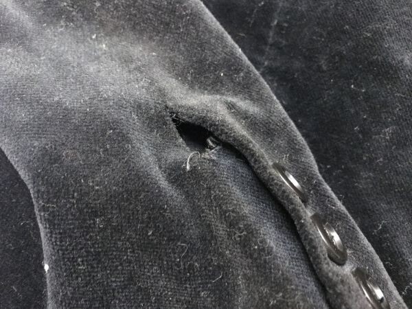 [備考/目立つダメージ]:袖口ボタンの根元ステッチ取れ