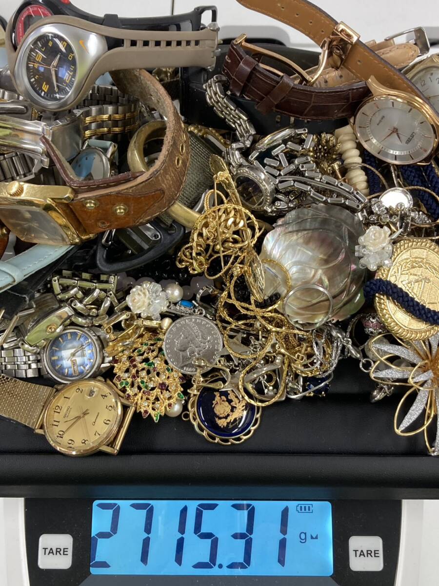 | 1円~ 約2.7kg アクセサリーおまとめ 大量 ネックレス リング 色石 ブローチ カフス タイピン 金杯 時計 1028① |