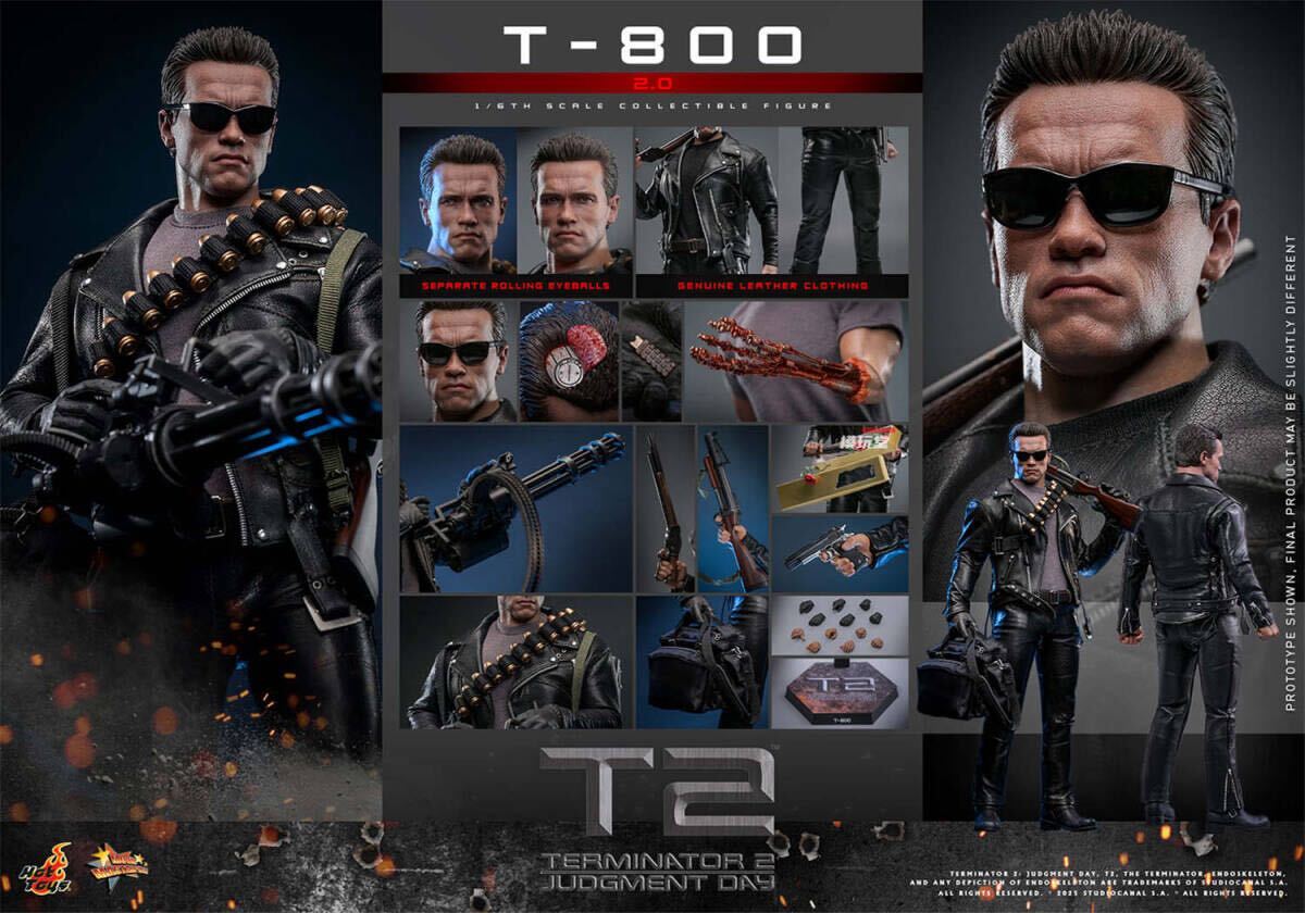 『ターミネーター2』に登場するT-800を、全高約32cm、30箇所以上が可動するハイエンドな1/6スケールのフィギュアとして立体化。演じるアーノルド・シュワルツェネッガーの肖像権をクリアしたヘッドは、新規で開発。眼球可動ギミックを搭載し、自由な視線変更によって、まるで生きているかのような存在感を醸し出すことが可能だ。皮膚の質感、皺などを再現すべく、一つひとつハンドペイントで塗装が施されている。頭部パーツを差し替えることで、CPUチップを取り出すシーンで頭皮がめくれた姿を再現できるぞ。また、着脱可能なサングラスが付いてくる。トレードマークのレザージャケットとパンツは、本革の素材を採用し、細部に至るまで精巧な仕上がり。ジャケットは着脱でき、グレーと黒のTシャツを差し替えられる。武器として、マシンガン、ショットガン、ピストル、グレネードランチャー、弾帯が付属。弾帯には、12個の弾薬を取り付け可能だ。アクセサリーとして、CPUチップ、ダッフルバッグ、3本のバラとギフトボックスが付属する。豊富な差し替え用ハンドパーツを併せて使用すれば、さまざまな劇中シーンを演出できるぞ。さらに、新規開発となる、エンドスケルトンの差し替え用左腕パーツが付いてくるのも嬉しいポイントだ!台座は、作品のロゴがデザインされた特別仕様となっている。