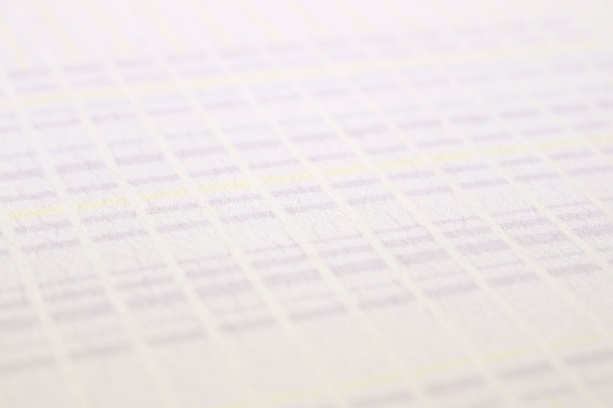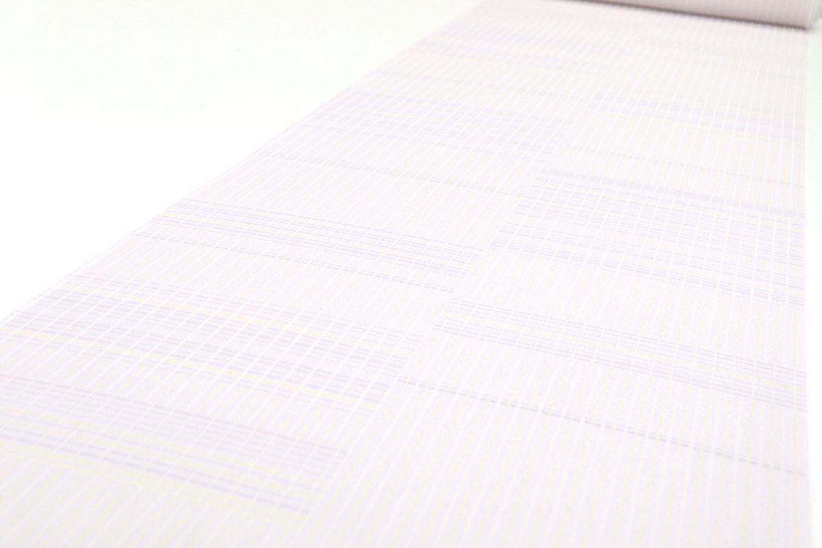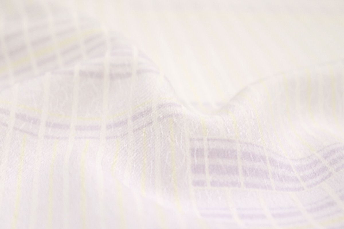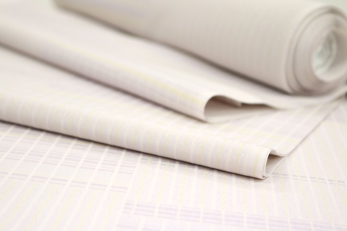 全体には白藤色、藤色、薄黄色のお色目のストライプやボーダーが市松状に染められております。